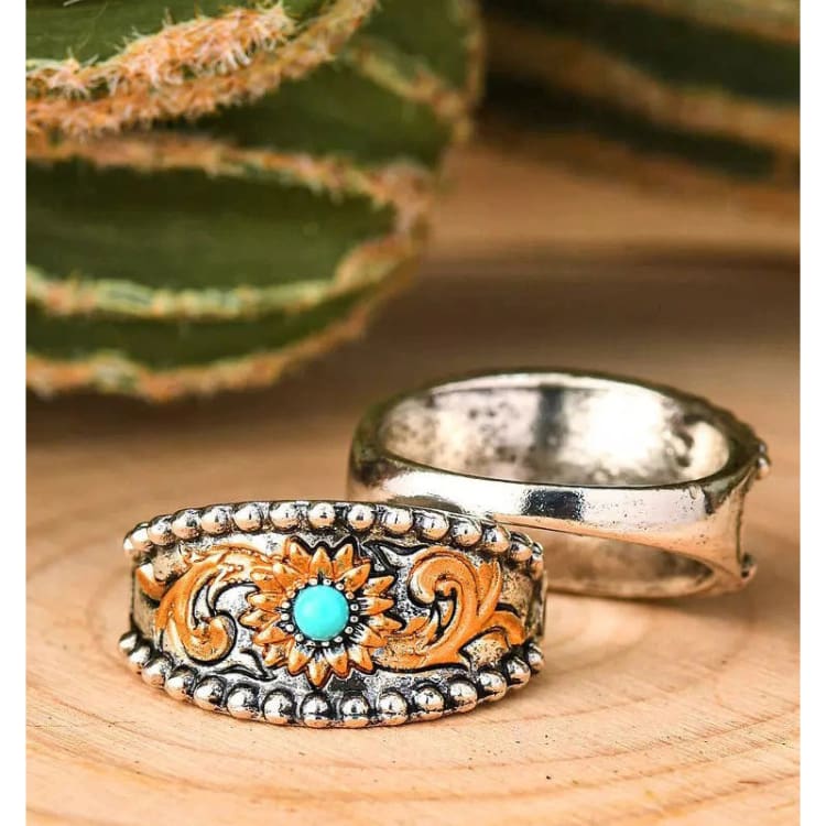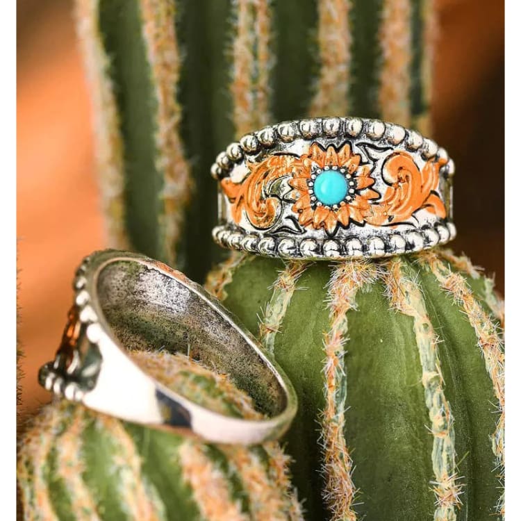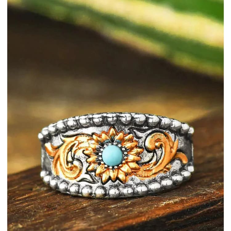 Il est ici représenté en turquoise sur une bague vintage entourée de fleur de lys vous offrant ainsi un style vintage.