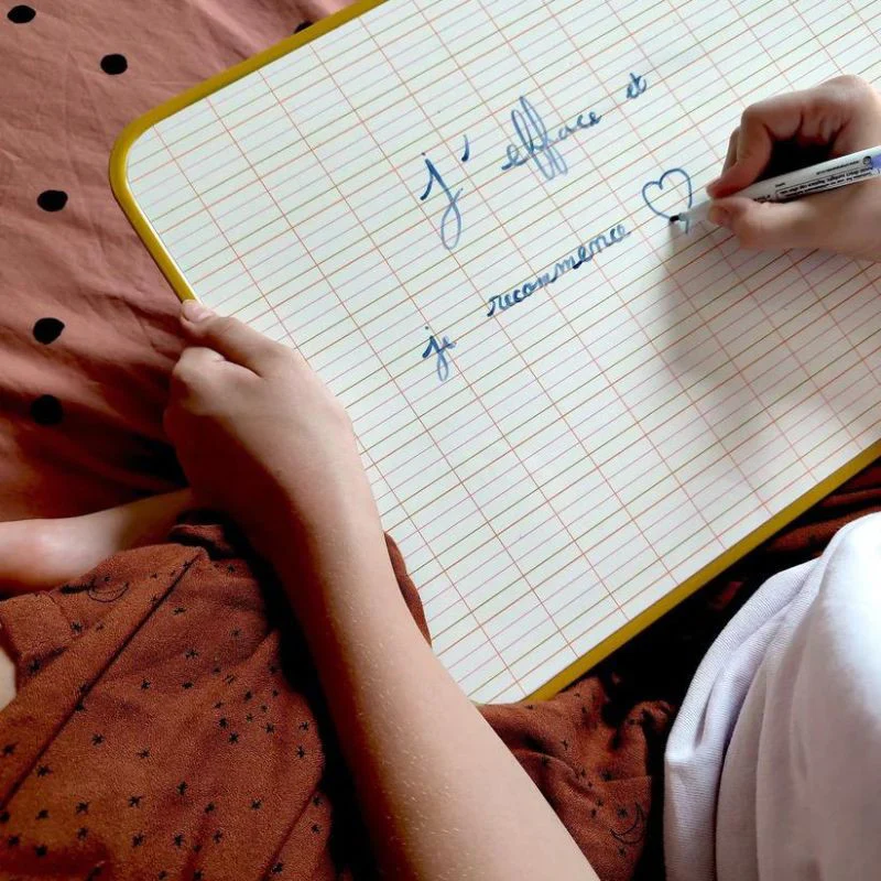 Ma cabane à Rêves® propose de transformer la dictée en moment ludique pour vos enfants et vous avec cette ardoise d’écriture souple et magnétique. Une petite faute d’orthographe à corriger ? Pas de problème, on l’efface avec le doigt ou avec une petite lingette microfibre et le tour est joué ! En effet, les tableaux souples sont recouverts d’une finition effaçable à sec ou à l’eau et utilisables avec les crayons Stabilo Woody 3en1.