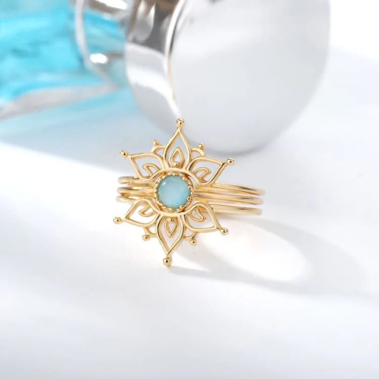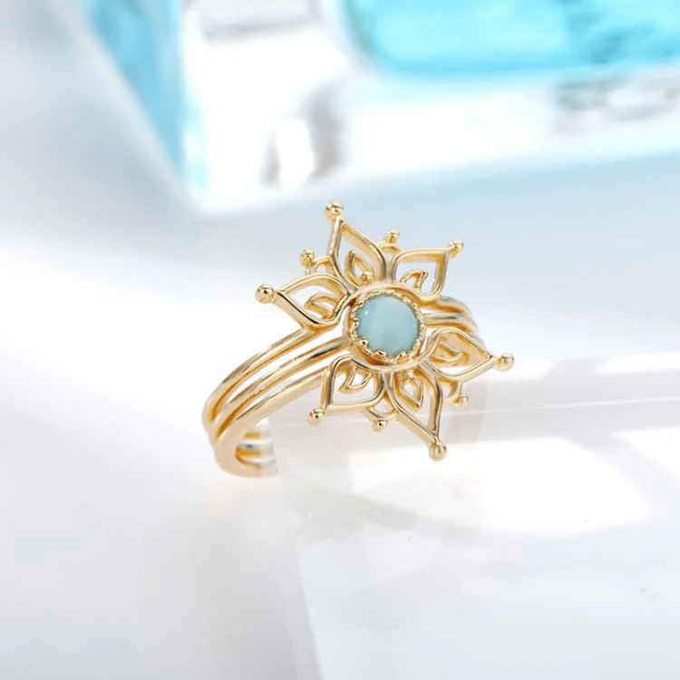 Représentant une magnifique fleur de lotus, cette bague accueille en son centre une pierre d’Amazonite.
