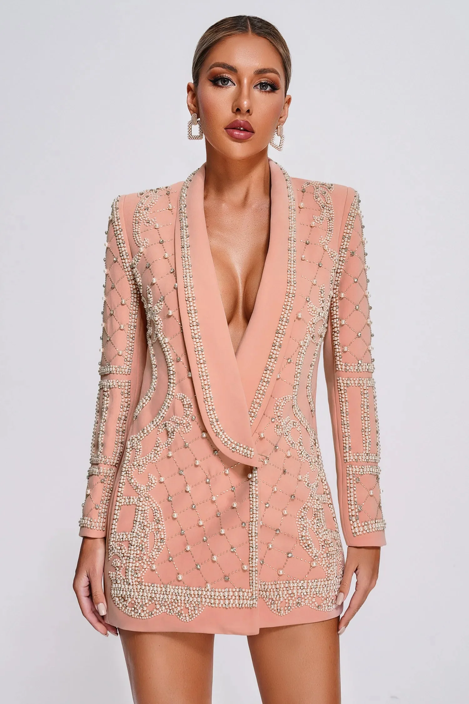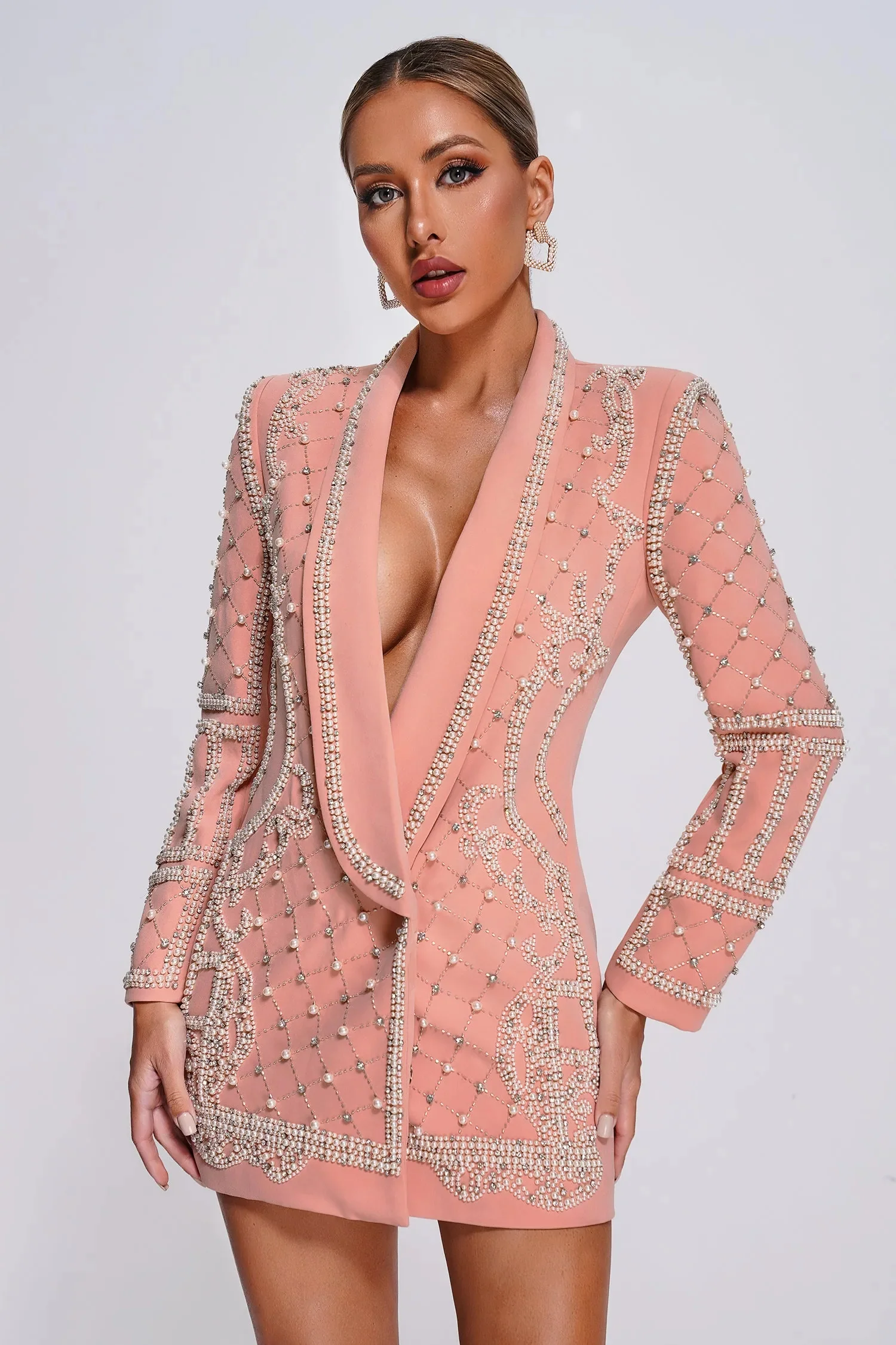 Modèle Robe/Blazer Couleur rose clair Ornée de perles Avec poches Double boutonnage