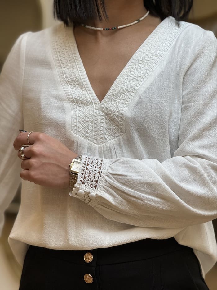 BLOUSE à ml col v broderie Taille : Mathilde mesure 1m65. Elle porte la taille S pour ce modèle. Taille : XS (34) / S (36) / M (38) / L (40) / XL (42) Composition & entretien : 30% LIN 70% VISCOSE Lavage à la main conseillé Besoin d’un conseil ? Consultez notre foire […]