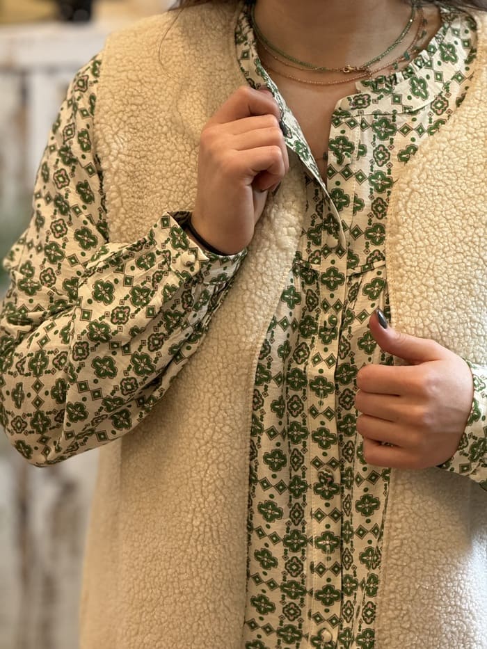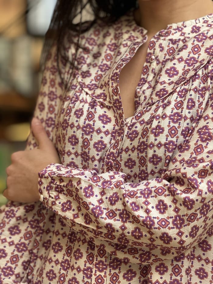 - Chemisier à manches longues col rond imprimé forme géométrique boutons devant
