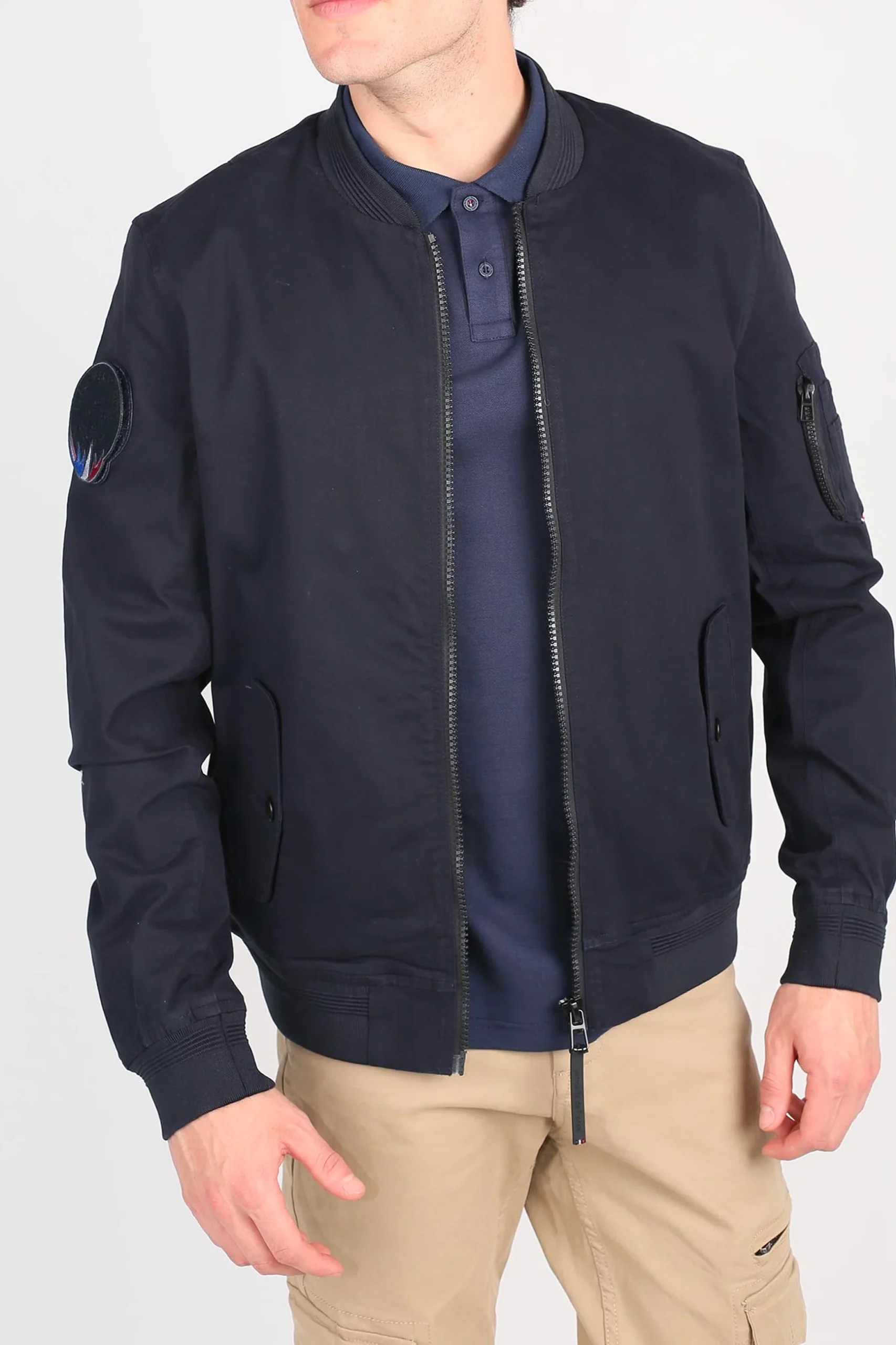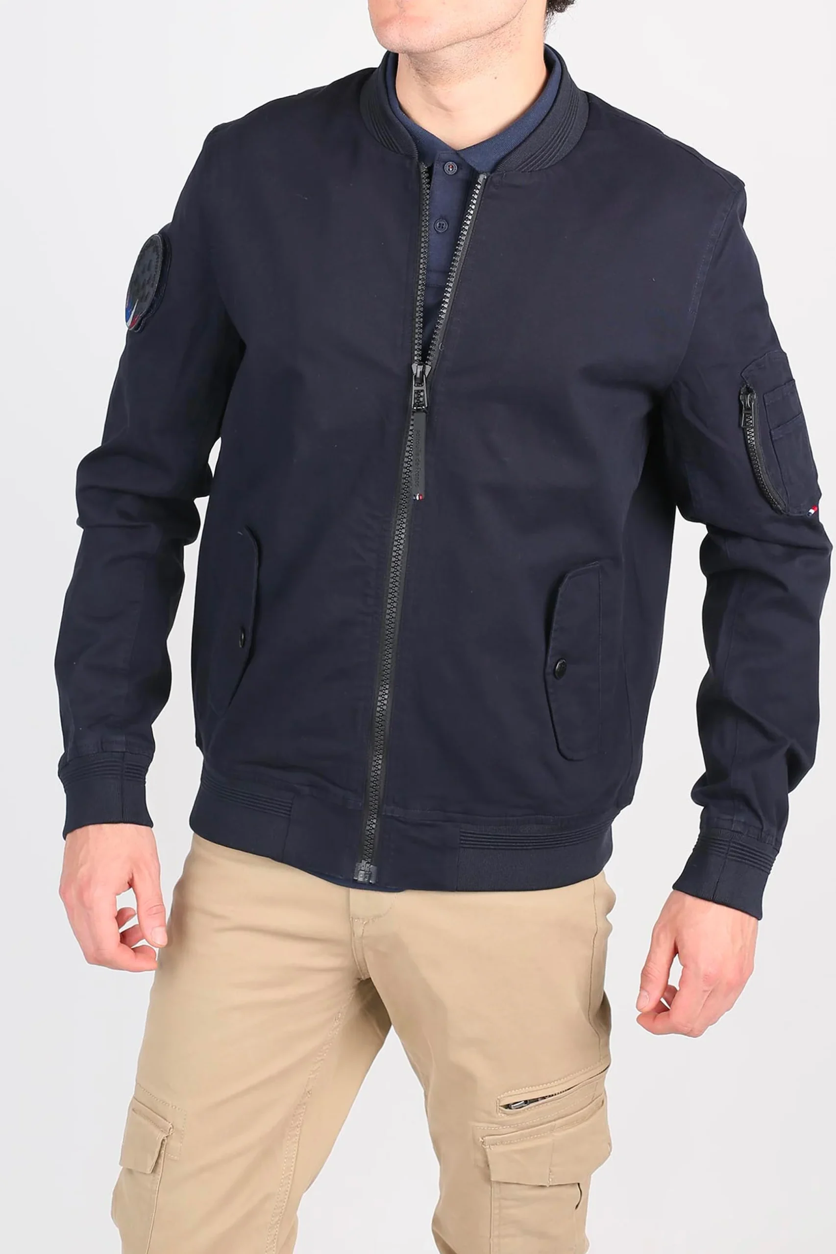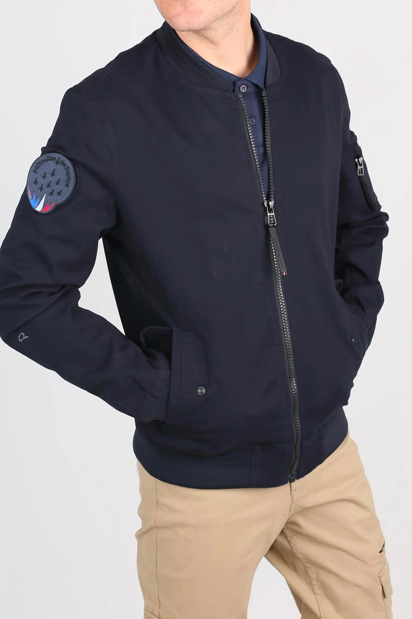Pièce à manches TIGER AERO en coton, zip central, 2 poches à rabats latérales avec un boutton de pression, logo PATROUILLE DE FRANCE au niveau de l’épaule droite, poche zipée arrondie au niveau de l’épaule gauche, petit drapeau français brodé sous la poche arrondie, composition : 98% COTON – 2% ELASTHANNE. Collection Patrouille De France by Redskins.