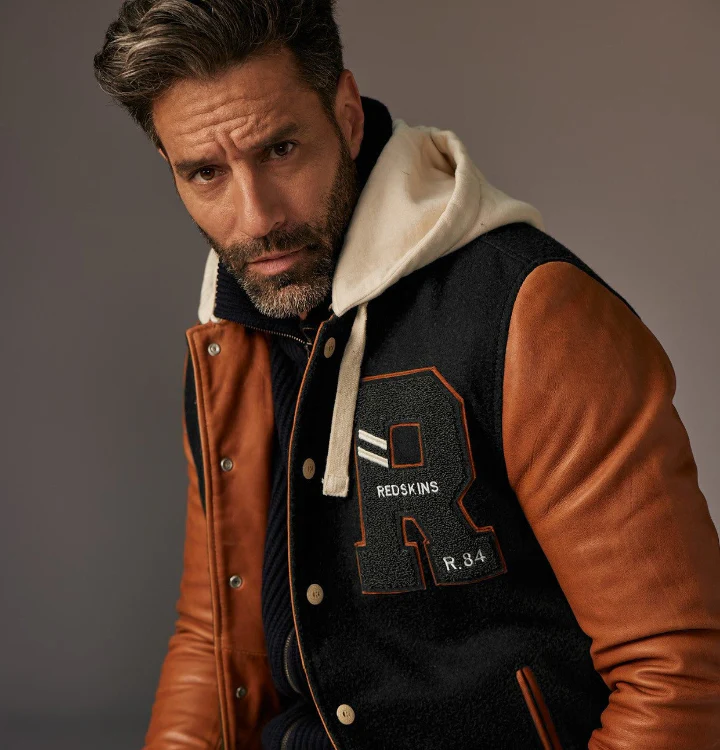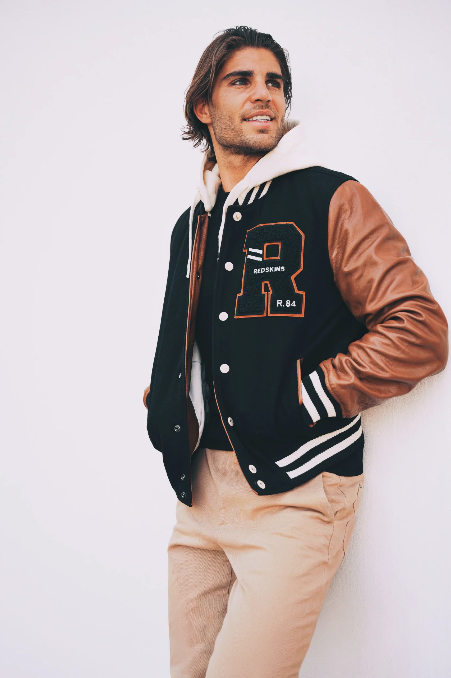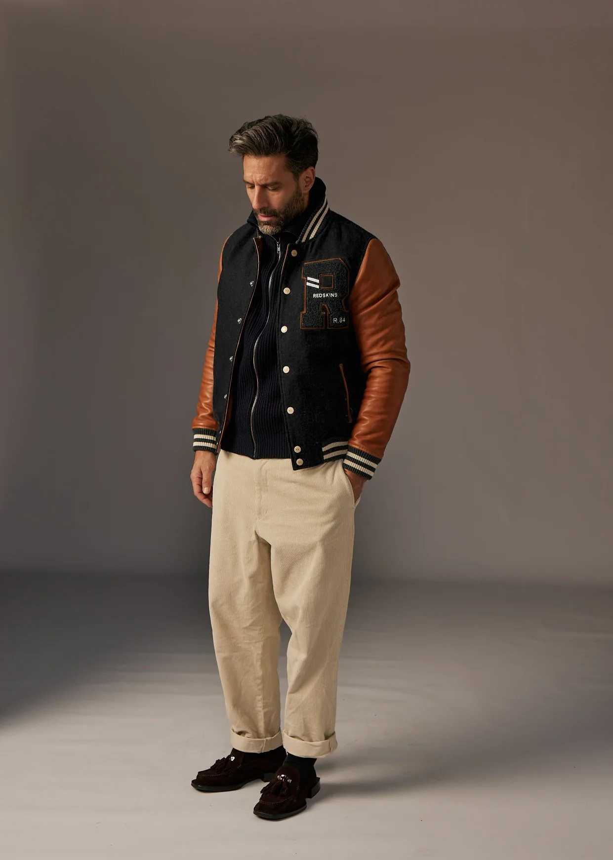 Ce blouson se distingue par sa composition en cuir d’agneau et drap de laine, offrant une texture à la fois douce et robuste. La base noire est accentuée par des manches en cuir, créant un contraste élégant. Le patch brodé avec un grand « R » sur la face avant gauche ajoute une touche sportive et personnalisée, tandis que les rayures sur les bords des manches et du col renforcent son style universitaire.