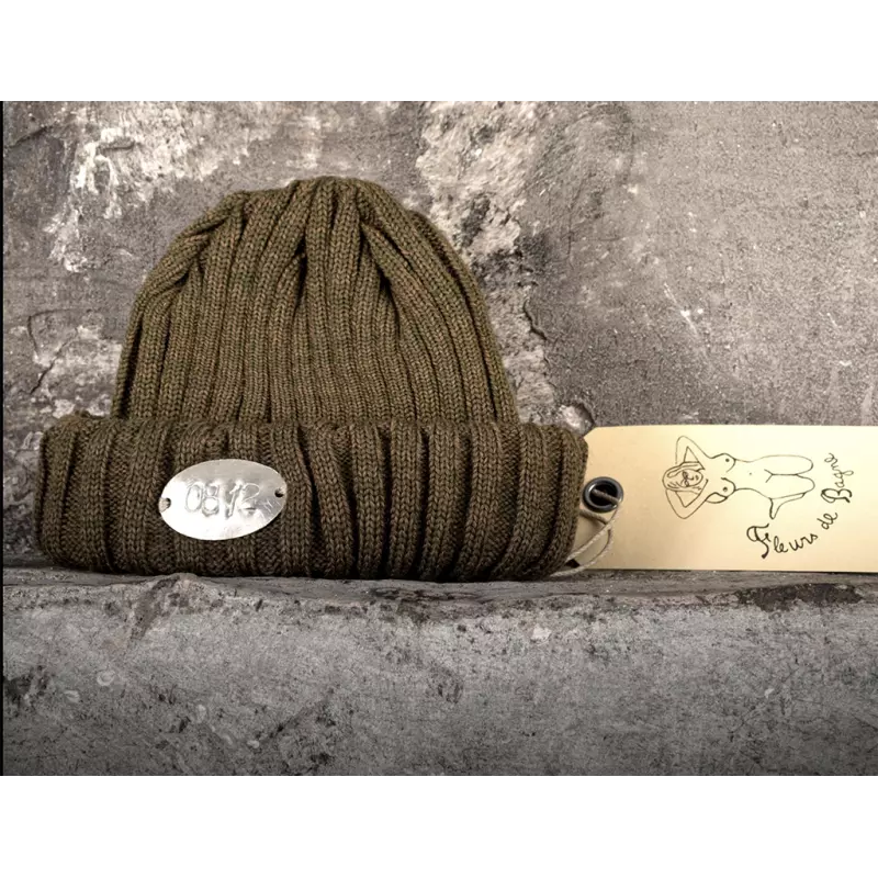 Bonnet 100% Laine Vierge .Tricotage côte 3/3 serréChaud & Résistant.Taille unique.Matricule Différent pour chaque modèle. Matricule frappé à la main sur une plaque d’aluminiumINSPIRATION MILITAIRE (Bonnet Commando MARINE)Fabrication française. Tricoté à GUIDEL dans le Morbihan