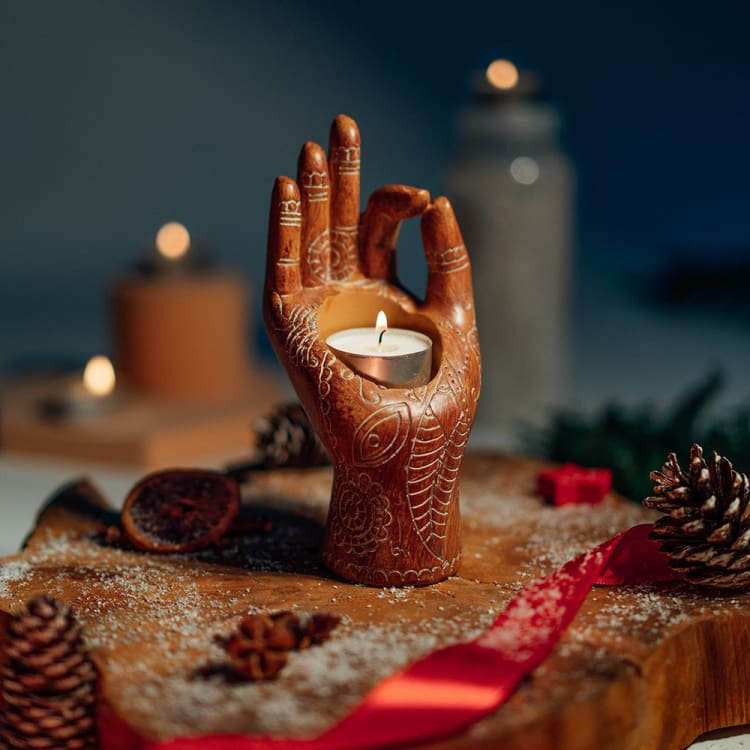 Ce bougeoir représente l’un des gestes les plus symboliques de Bouddha connu sous le nom de Vitarka Mudrā, c’est la phase d’enseignement de Bouddha.
