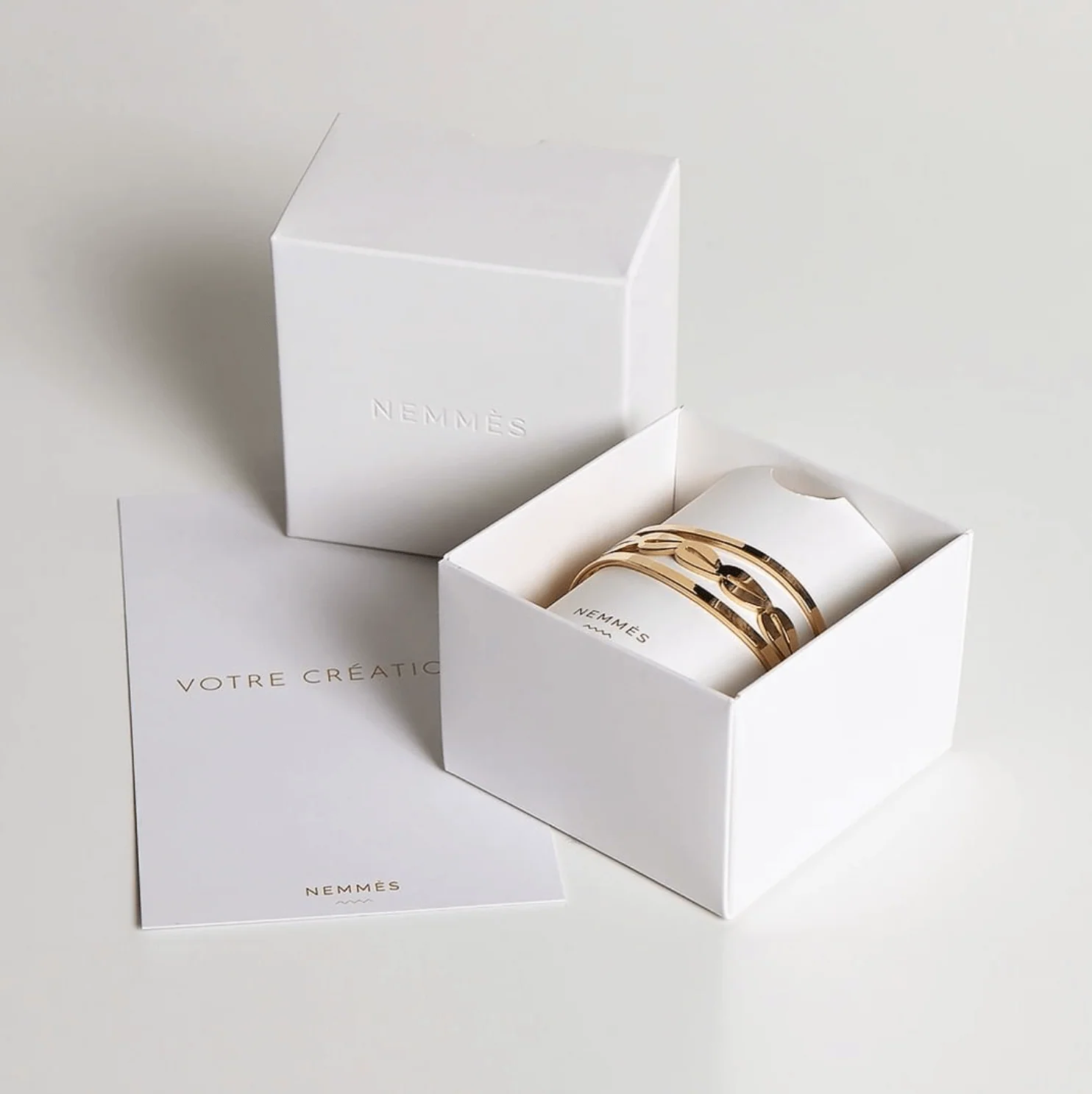 Du sur-mesure accessible, pour un bracelet personnalisé en laiton recyclé et doré à l’or fin (1 micron) ou plaqué argent (3 microns), fabriqué en France. Ce coffret lui permettra de créer soi même le bracelet qui lui ressemble. Un outil en ligne facile et ludique lui donnera de multiples possibilités de création.