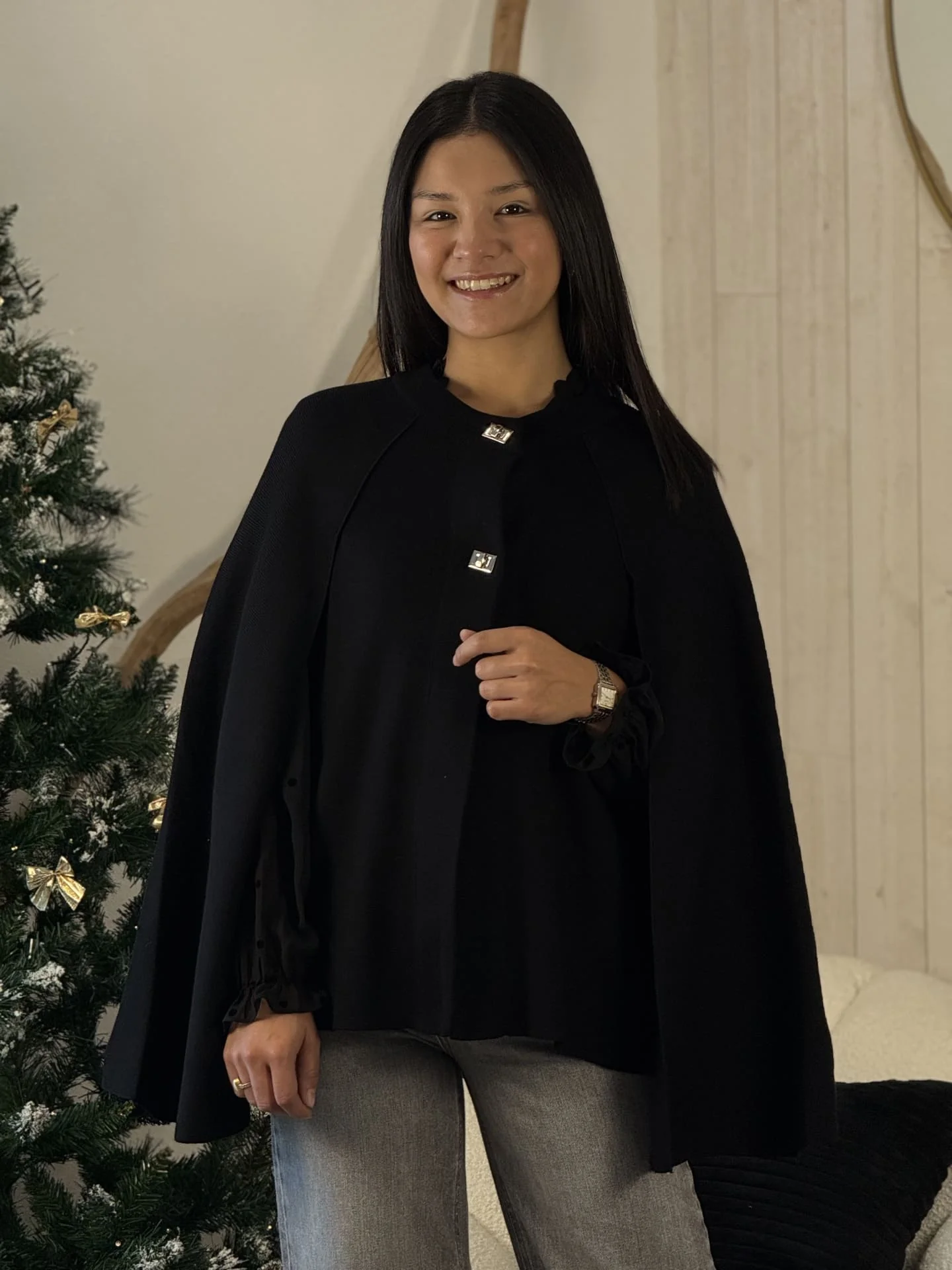 Cape col rond avec 2 boutons argent Taille : Mathilde mesure 1m65 et Juliette mesure 1m63. Elles portent la taille Taille unique pour ce modèle. Taille : Taille unique Convient de la taille 36 à 42 Composition & entretien : 45% VISCOSE 28% POLYAMIDE 27% POLYESTER Lavage à la main conseillé Besoin d’un conseil ? […]