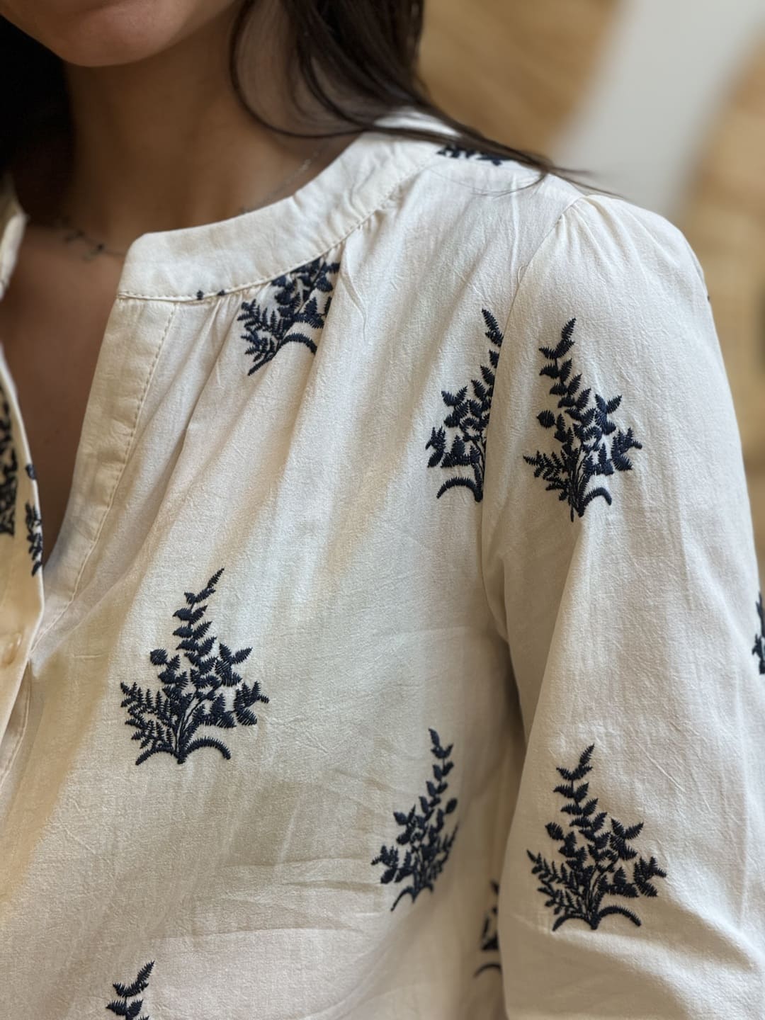 CHEMISE COL ROND – MOTIF BLEU FEUILLAGE Taille : Justine mesure 1m69. Elles portent la taille S/M pour ce modèle. Taille : S/M (36-38) – M/L (38-40) Composition & entretien : 100% COTON Lavage à la main conseillé Besoin d’un conseil ? Consultez notre foire aux questions ou contactez-nous via notre formulaire de contact
