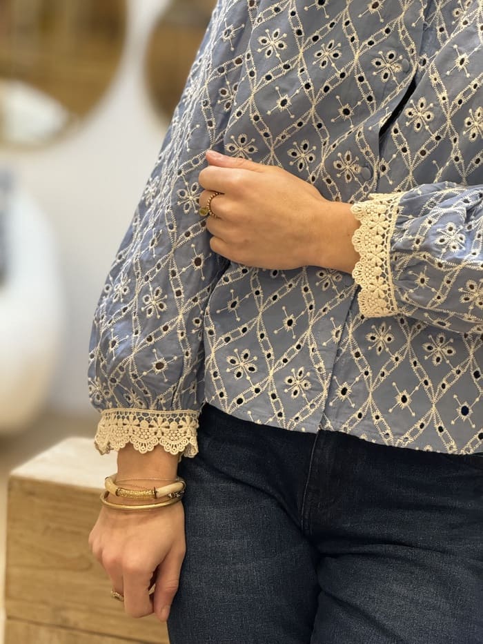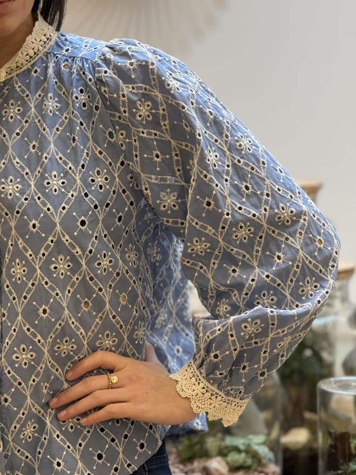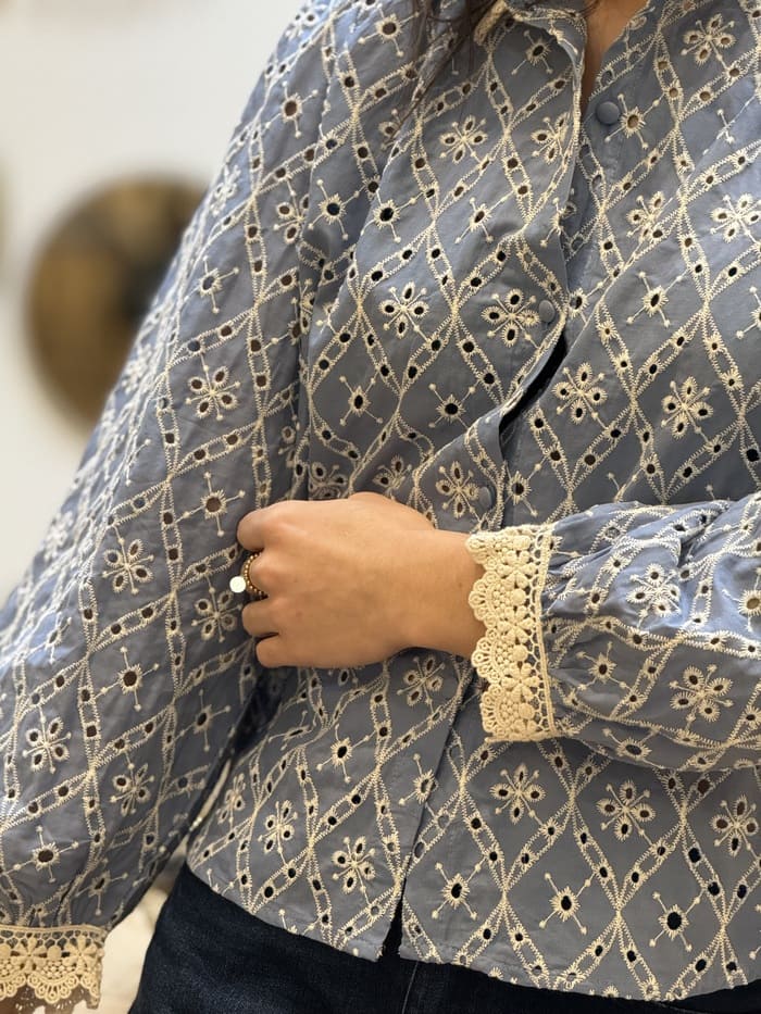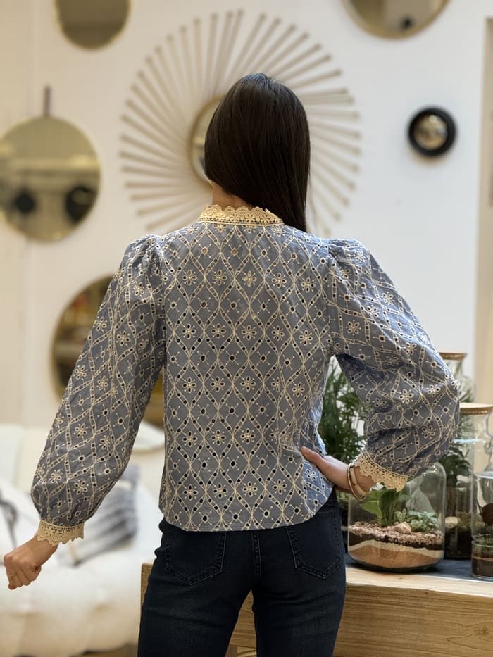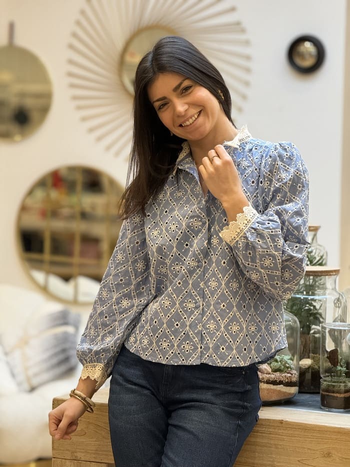 - Chemise à ml col haut + bout manche dentelle + broderie