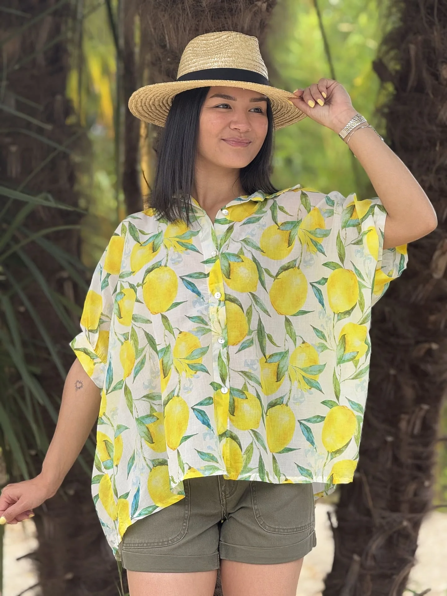 CHEMISIER à mc imprimé citrons ou oranges Taille : Justine mesure 1m69 et Mathilde 1m65. Elles portent la taille unique pour ce modèle. Taille unique Convient de la taille 36 à 42. Composition & entretien : 100% COTON Lavage à la main conseillé Besoin d’un conseil ? Consultez notre foire aux questions ou contactez-nous via […]
