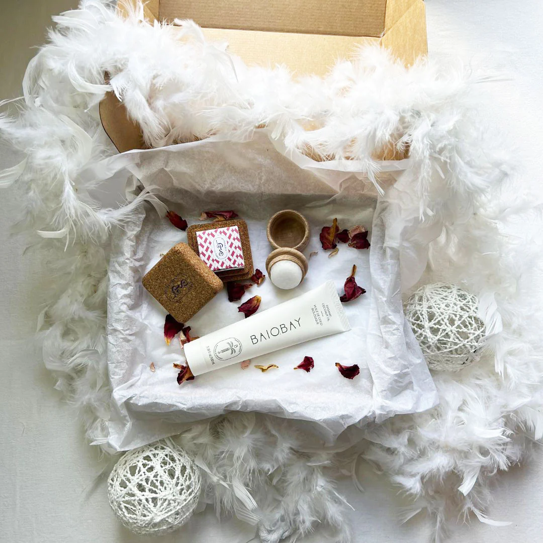 Un coffret cadeaux 100% eco-friendly « Au format voyage », livré dans son emballage cadeau en carton recyclé, papier de soie biodégradable blanc et du fil de jute naturel.