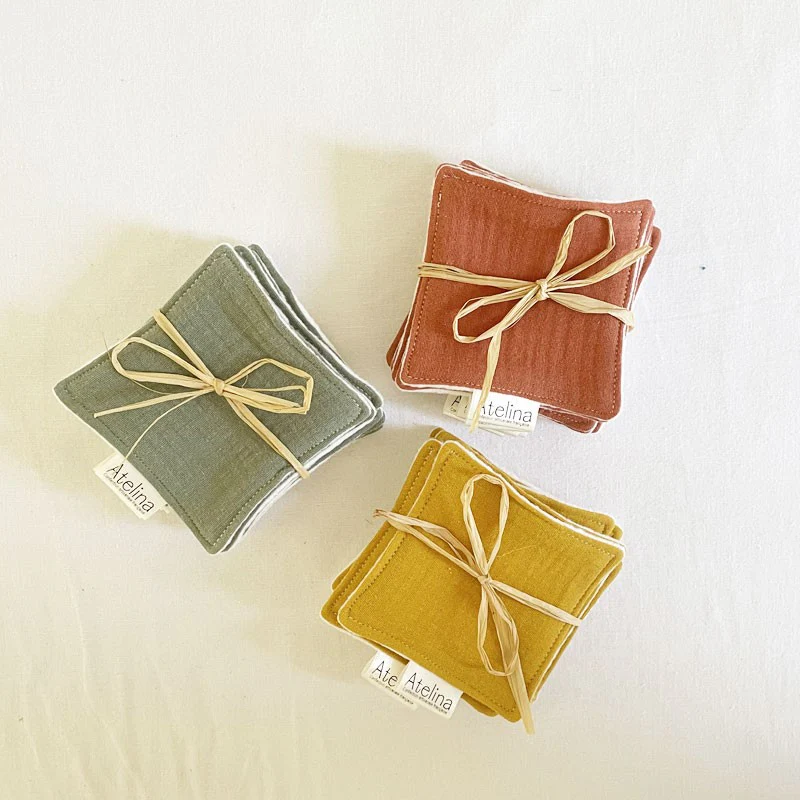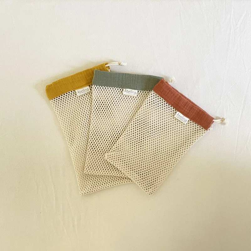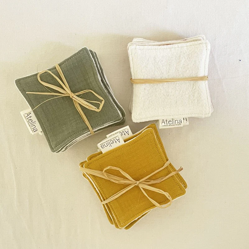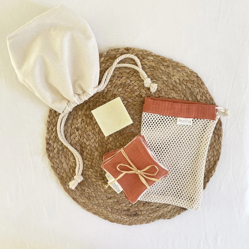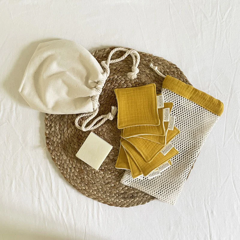 – Un filet et ses 7 lingettes (9 x 9 cm) pour un soin au quotidien, en coton BIO (GOTS) fait main, disponibles en trois couleurs. Une fois que vous les aurez testé, vous ne pourrez plus vous en passer et fini les cotons jetables !