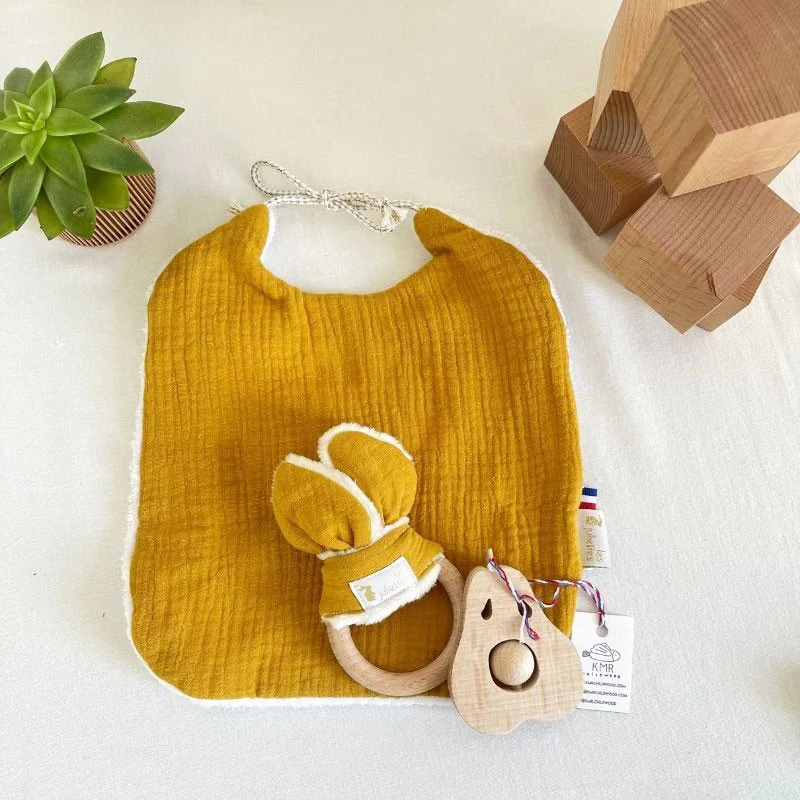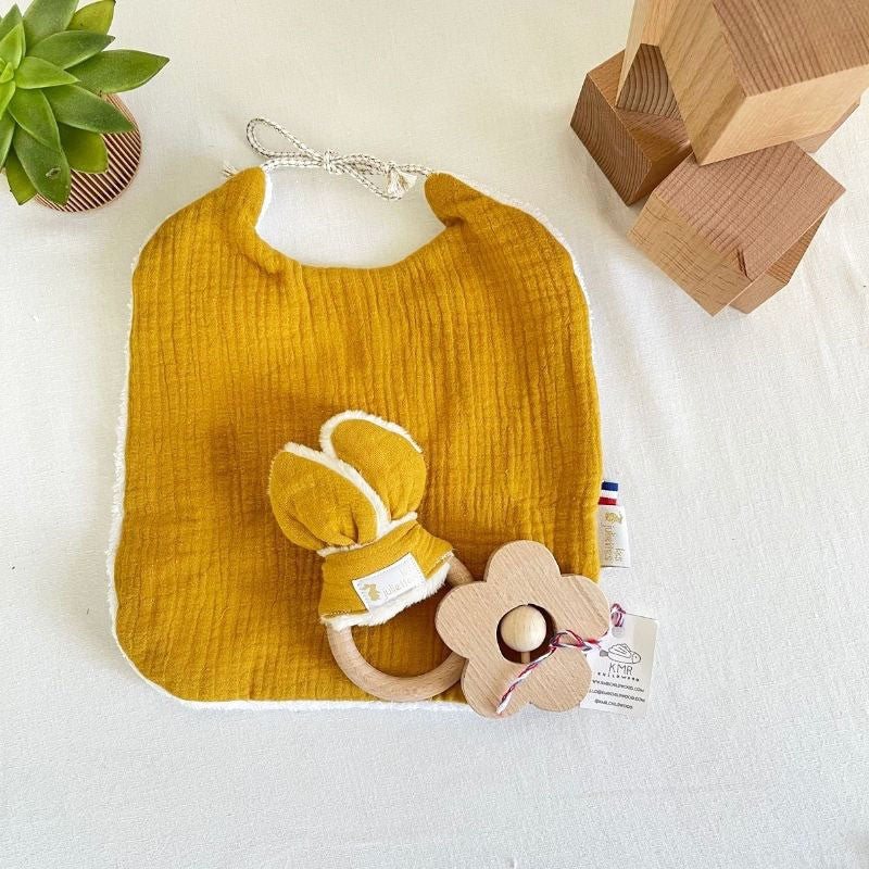 – Un bavoir et son anneau de dentition Lapinou moutarde, à utiliser dès la naissance avec 1 bavoir naissance en double gaze, jusque 12 mois. Accompagné de son anneau de dentition tout doux pour que votre trésor fasse ses dents.