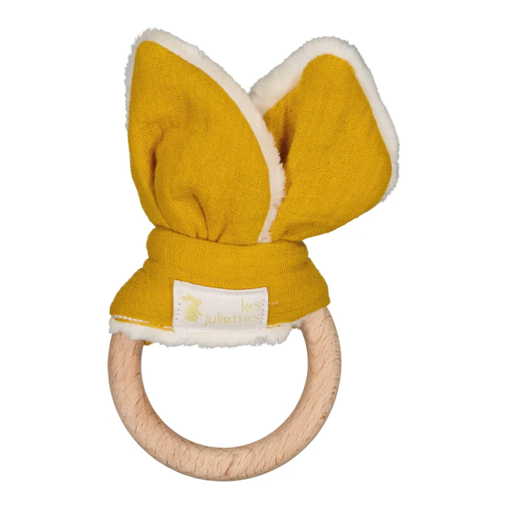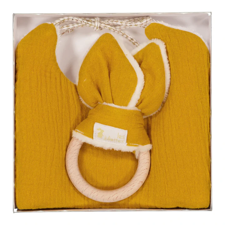 L’ensemble est constitué d’un bavoir de naissance en double gaze, et d’un anneau de dentition Lapinou. Il est présenté dans une jolie boite prête à offrir, existe en coffret avec un jeu d’éveil en bois, idéal en complément pour les premières dents.