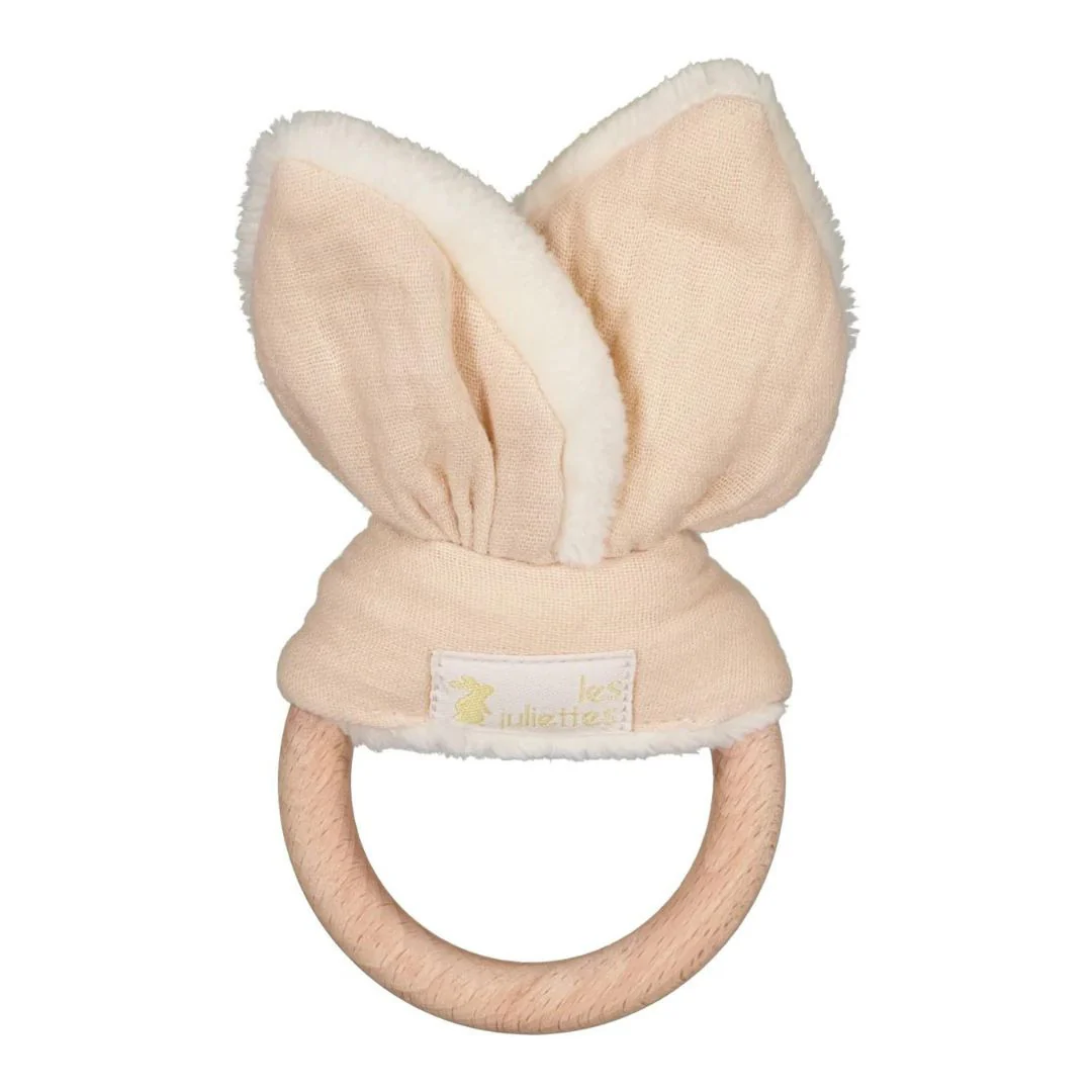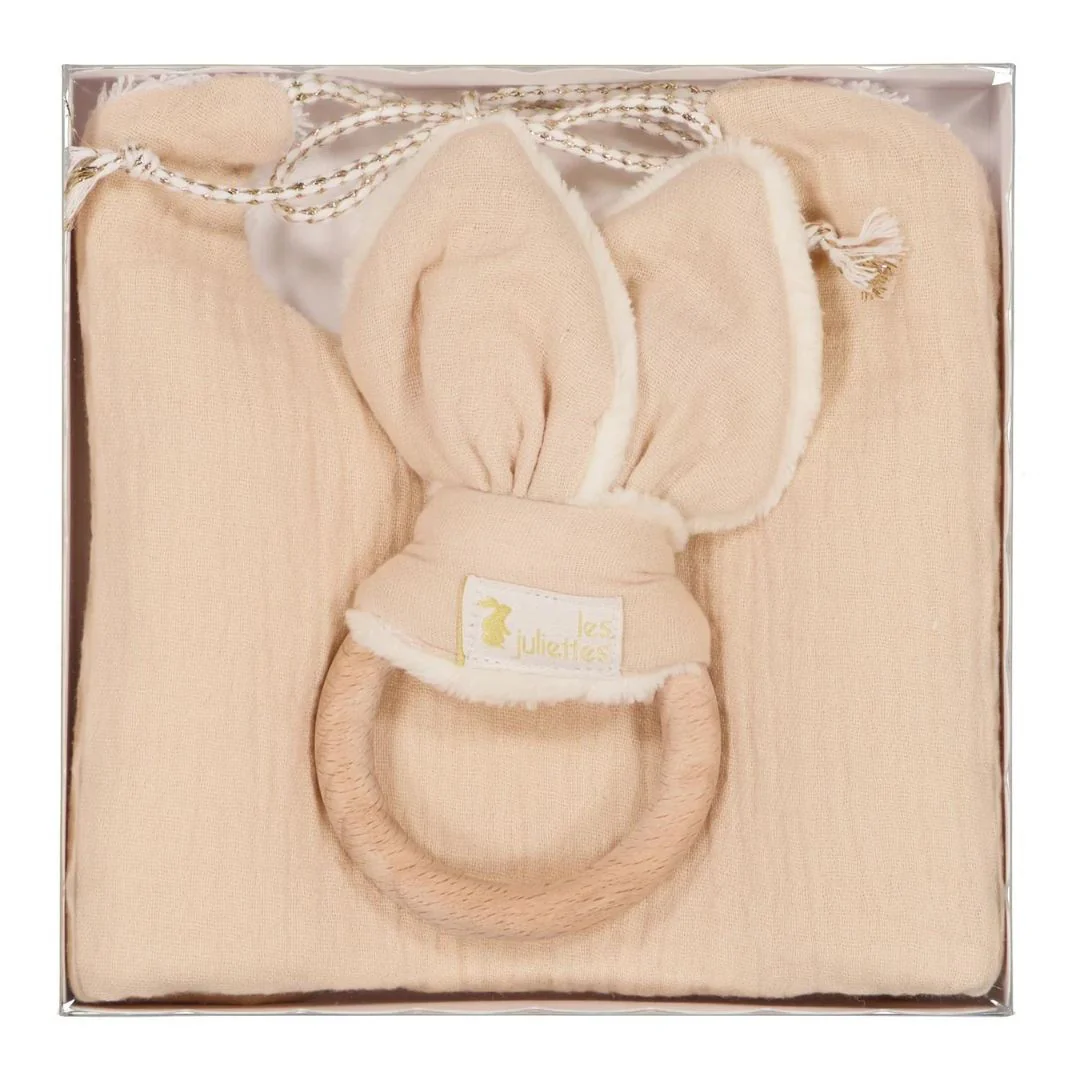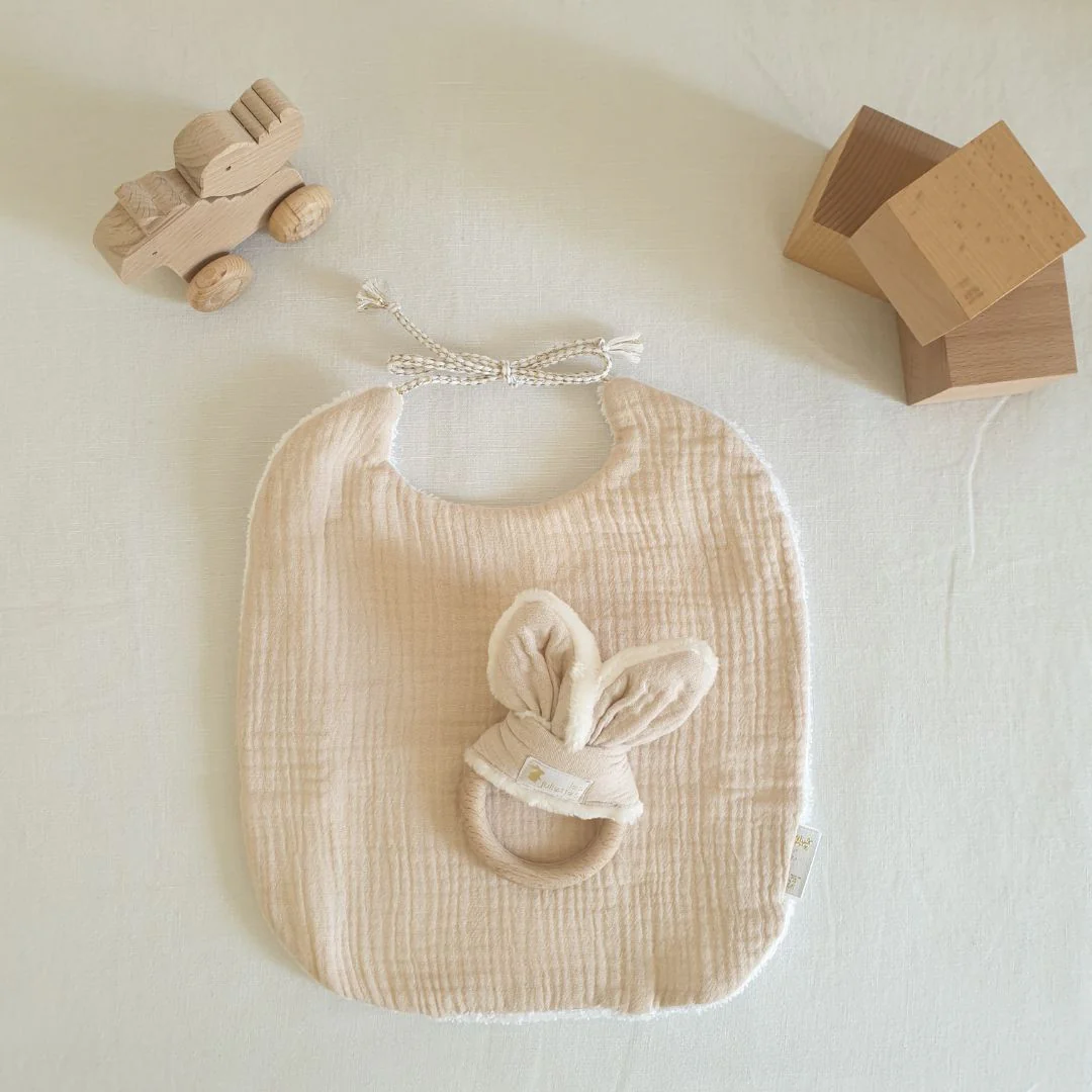 L’ensemble est constitué d’un bavoir de naissance en double gaze, et d’un anneau de dentition Lapinou. Il est présenté dans une jolie boite prête à offrir, existe en coffret avec un jeu d’éveil en bois, idéal en complément pour les premières dents.