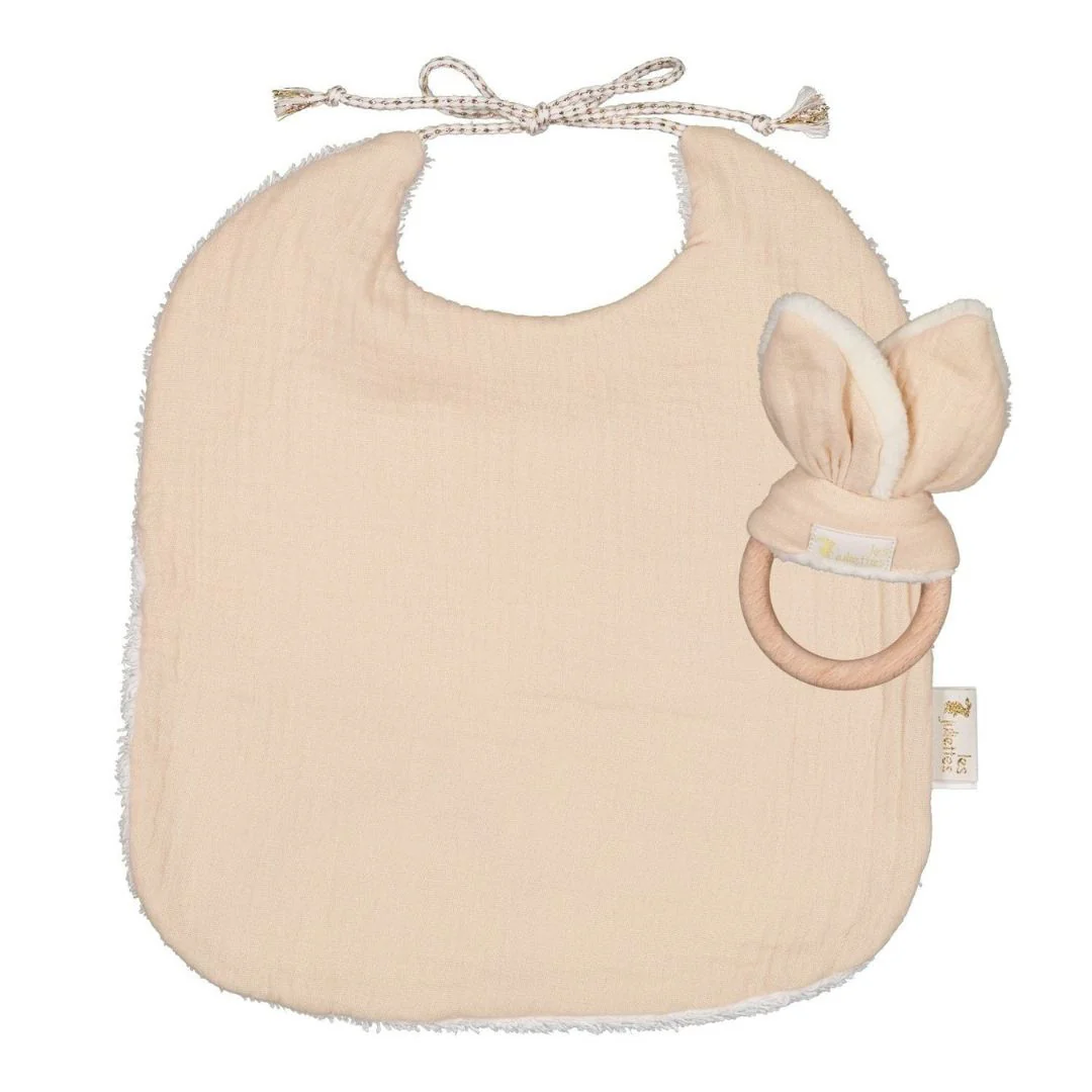 L’ensemble est constitué d’un grand bavoir de naissance jusqu’à 1 an et plus, avec son anneau de dentition Lapinou.