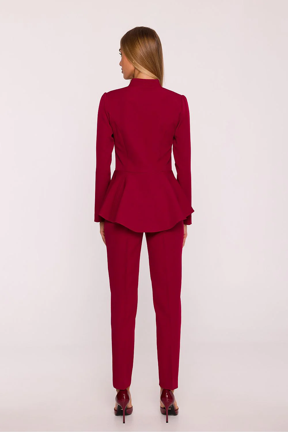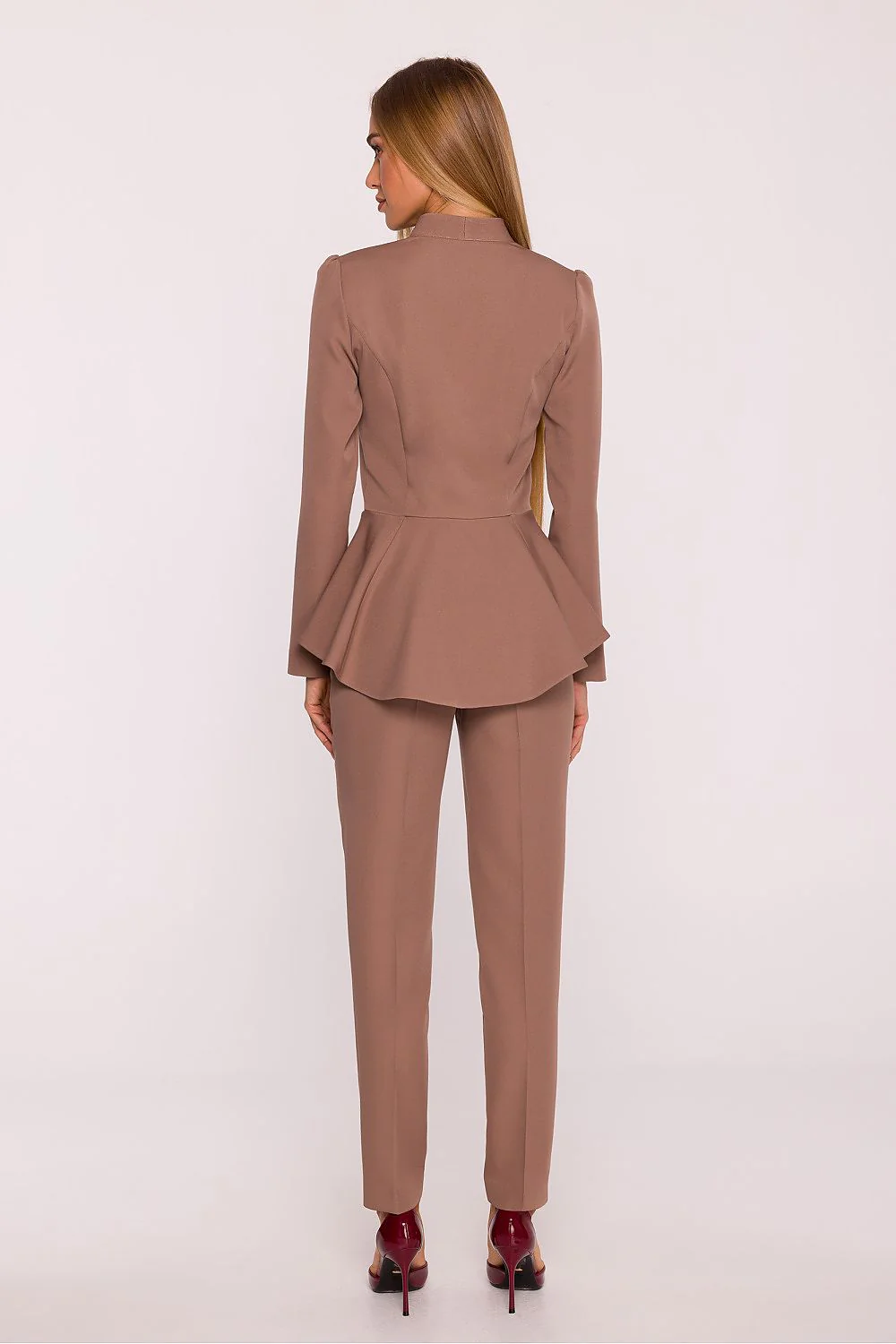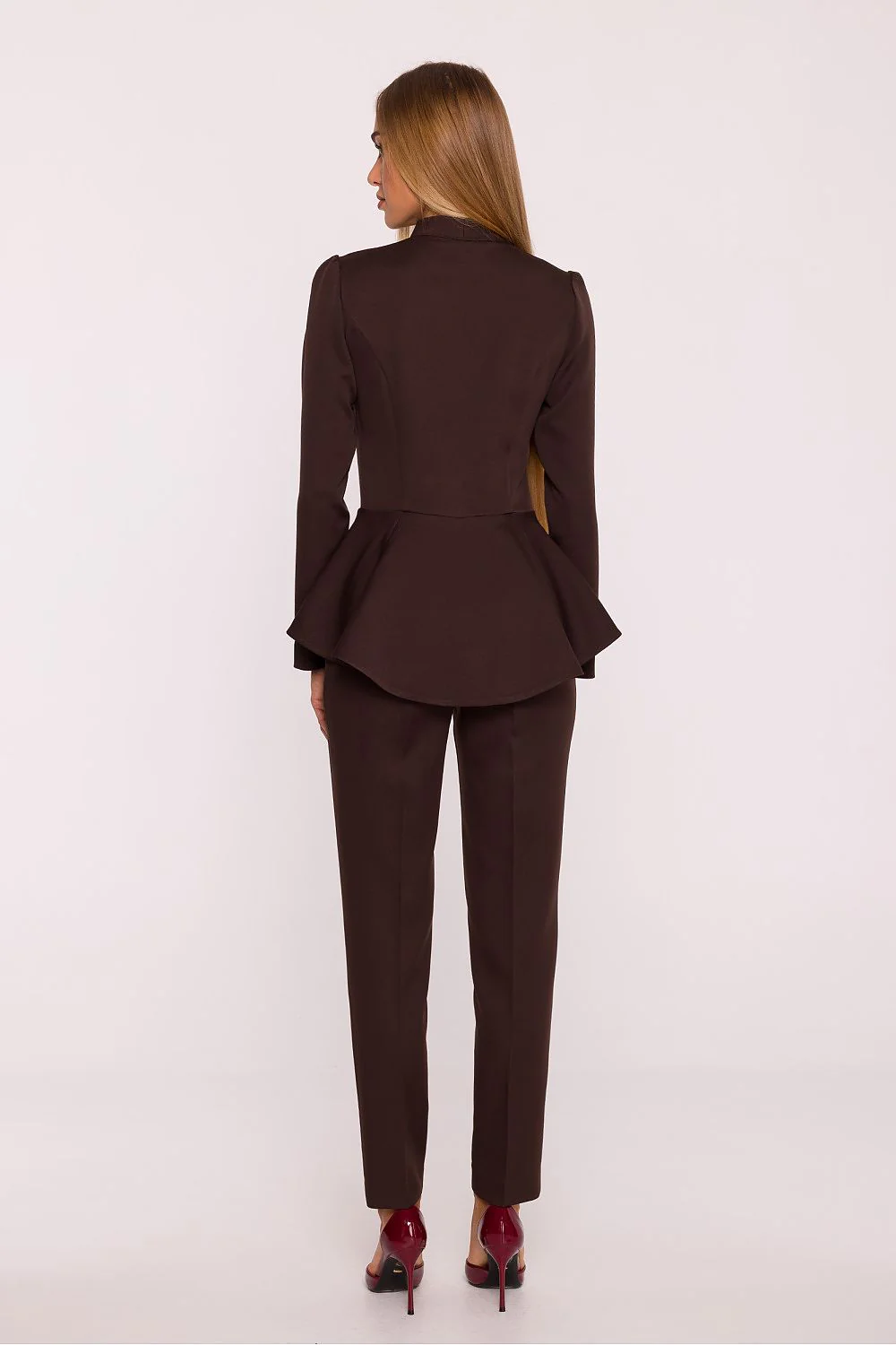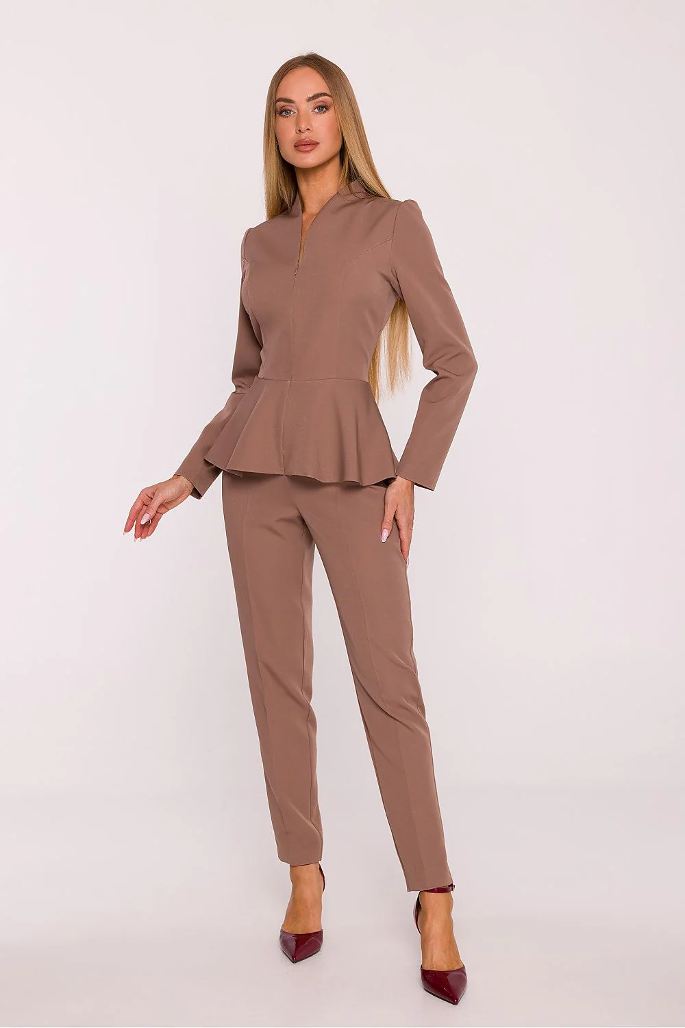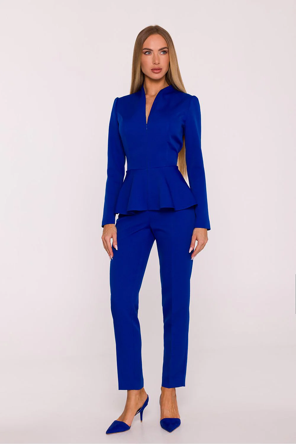 Combinaison élégante Haut à volant Col V Manches longues Taille cintrée Fermeture éclaire Pantalon pince coupe droite Tissus lisse Fabriquée en Europe