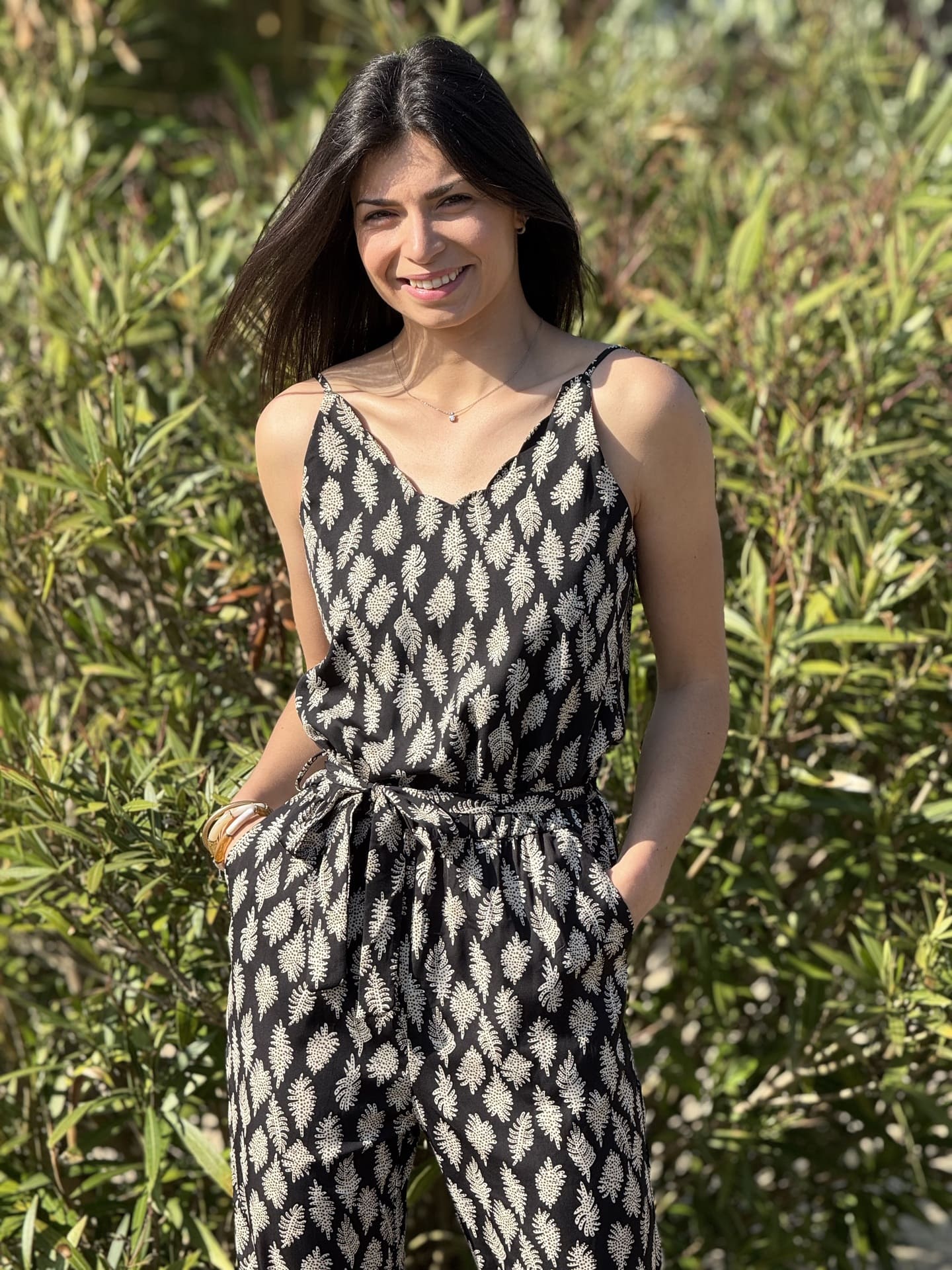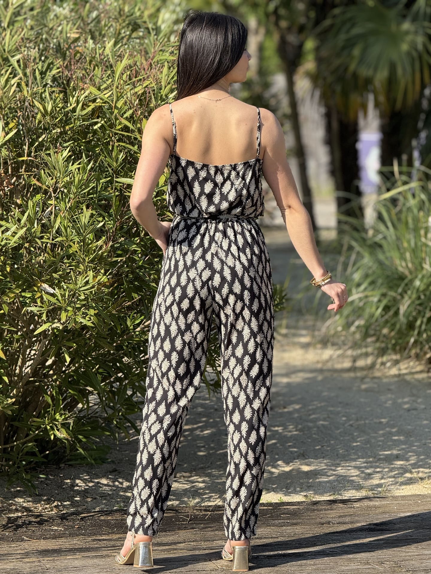 - COMBIPANTALON à bretelles col festonné imprimé feuilles + ceinture à la taille