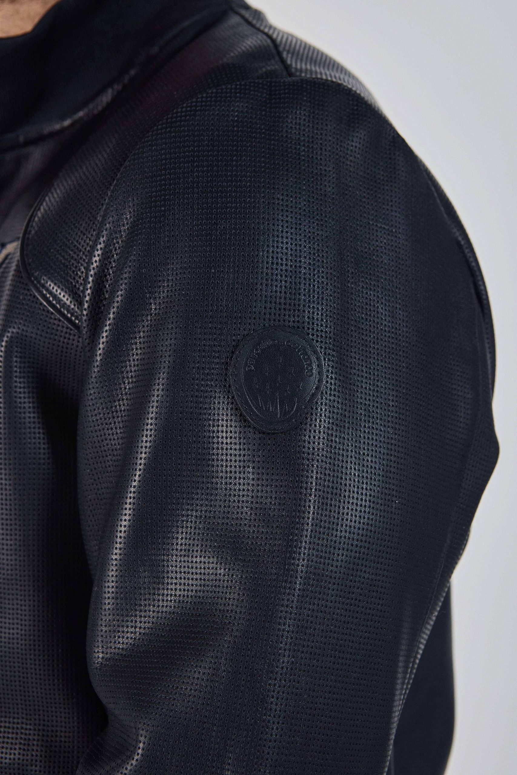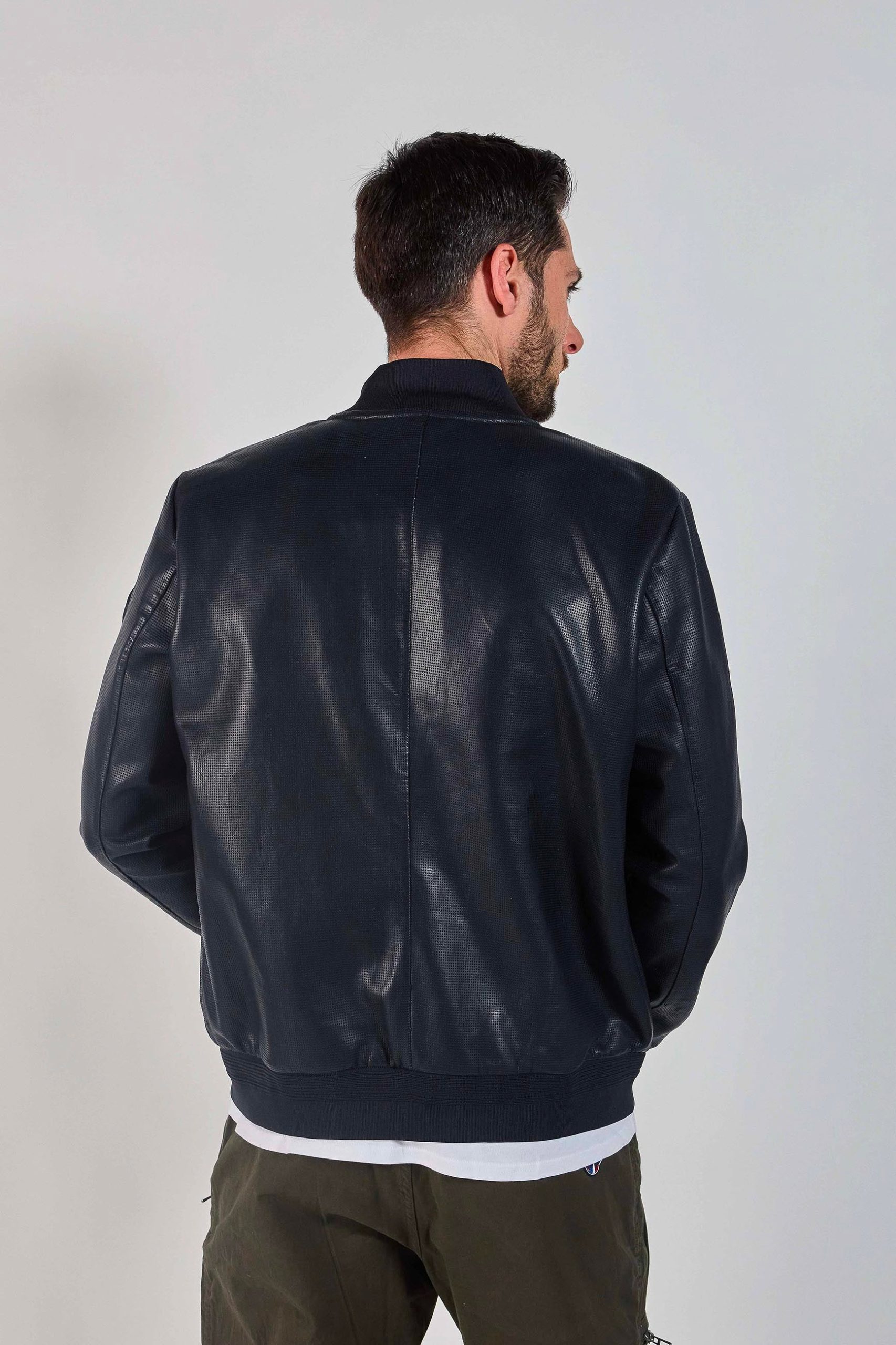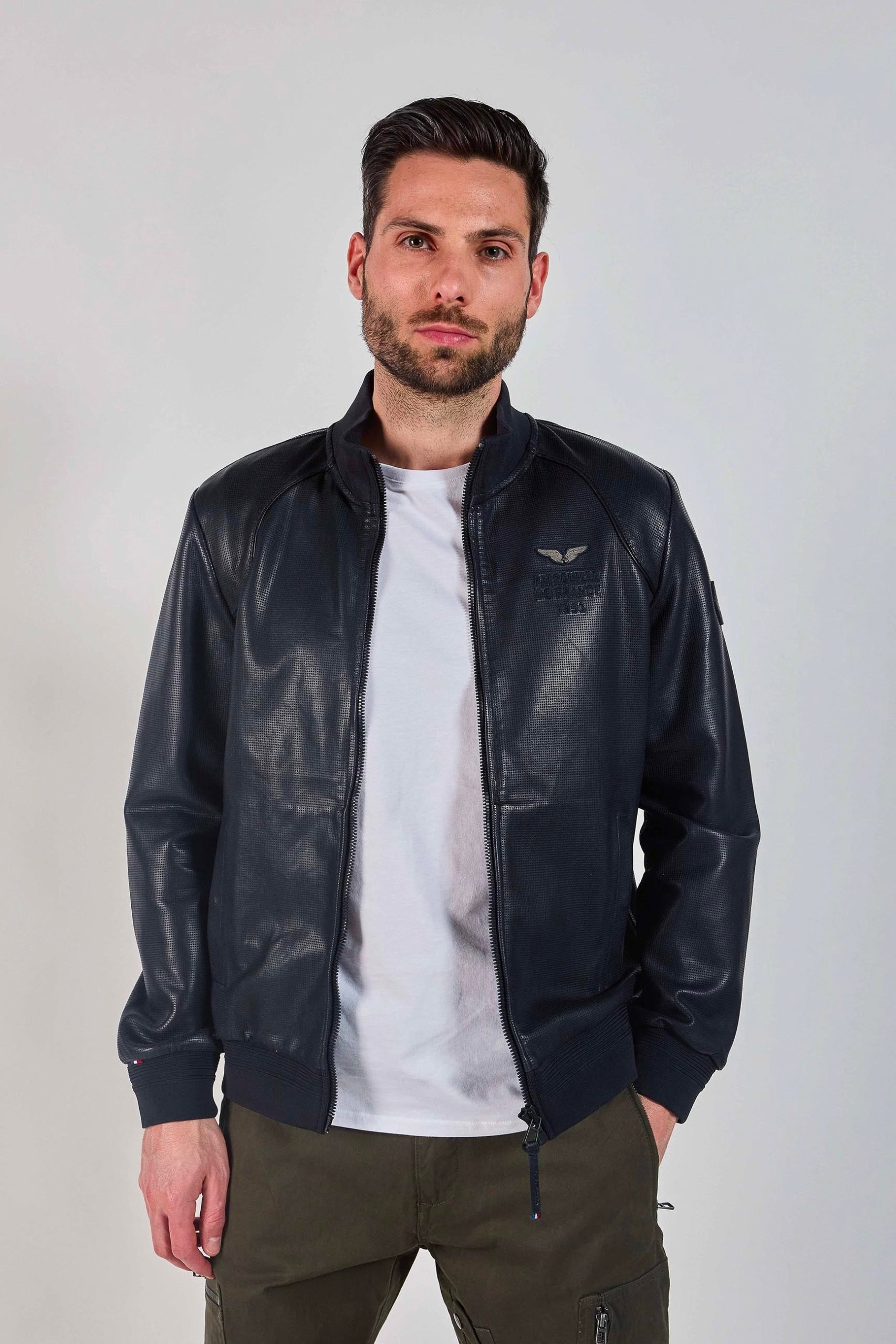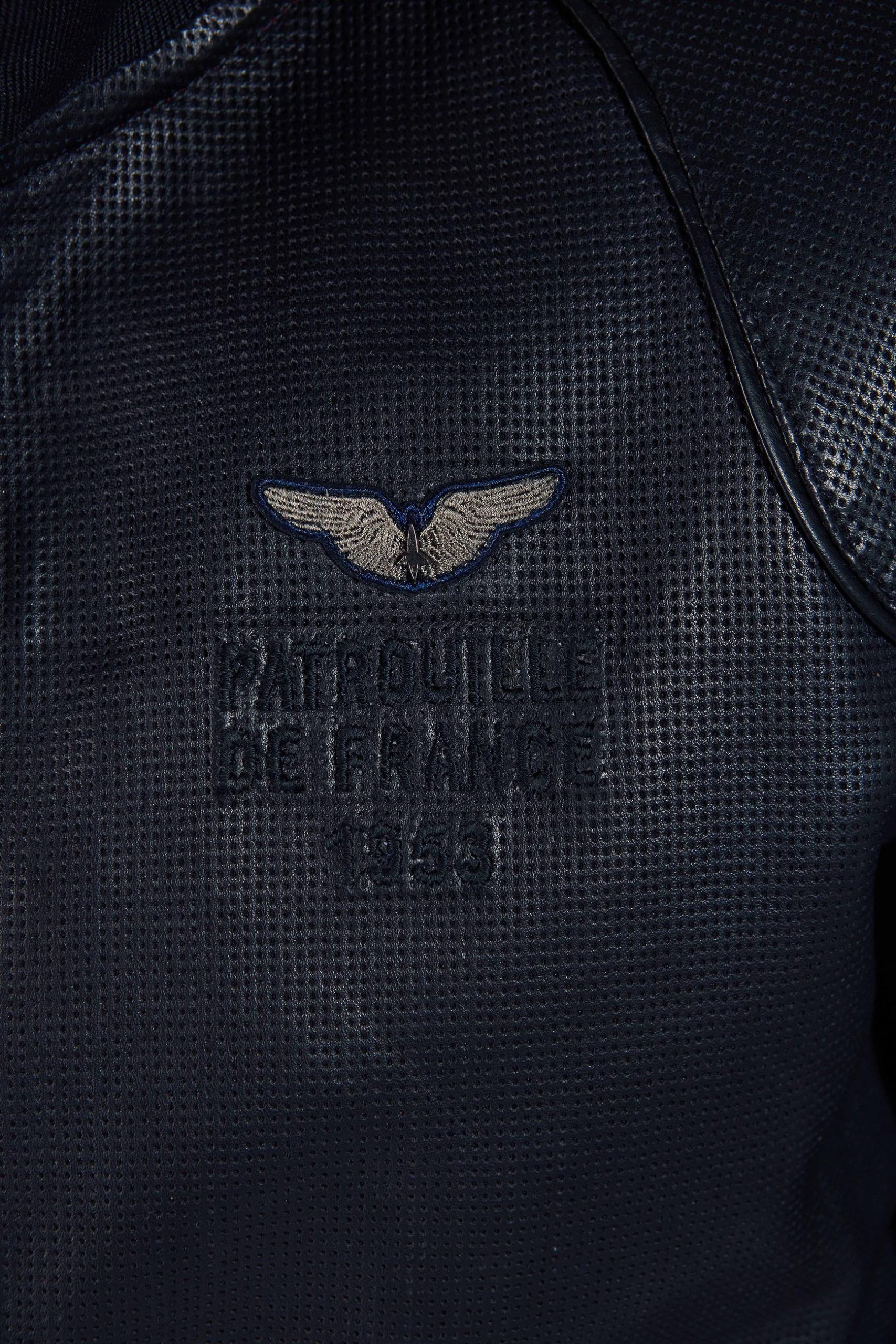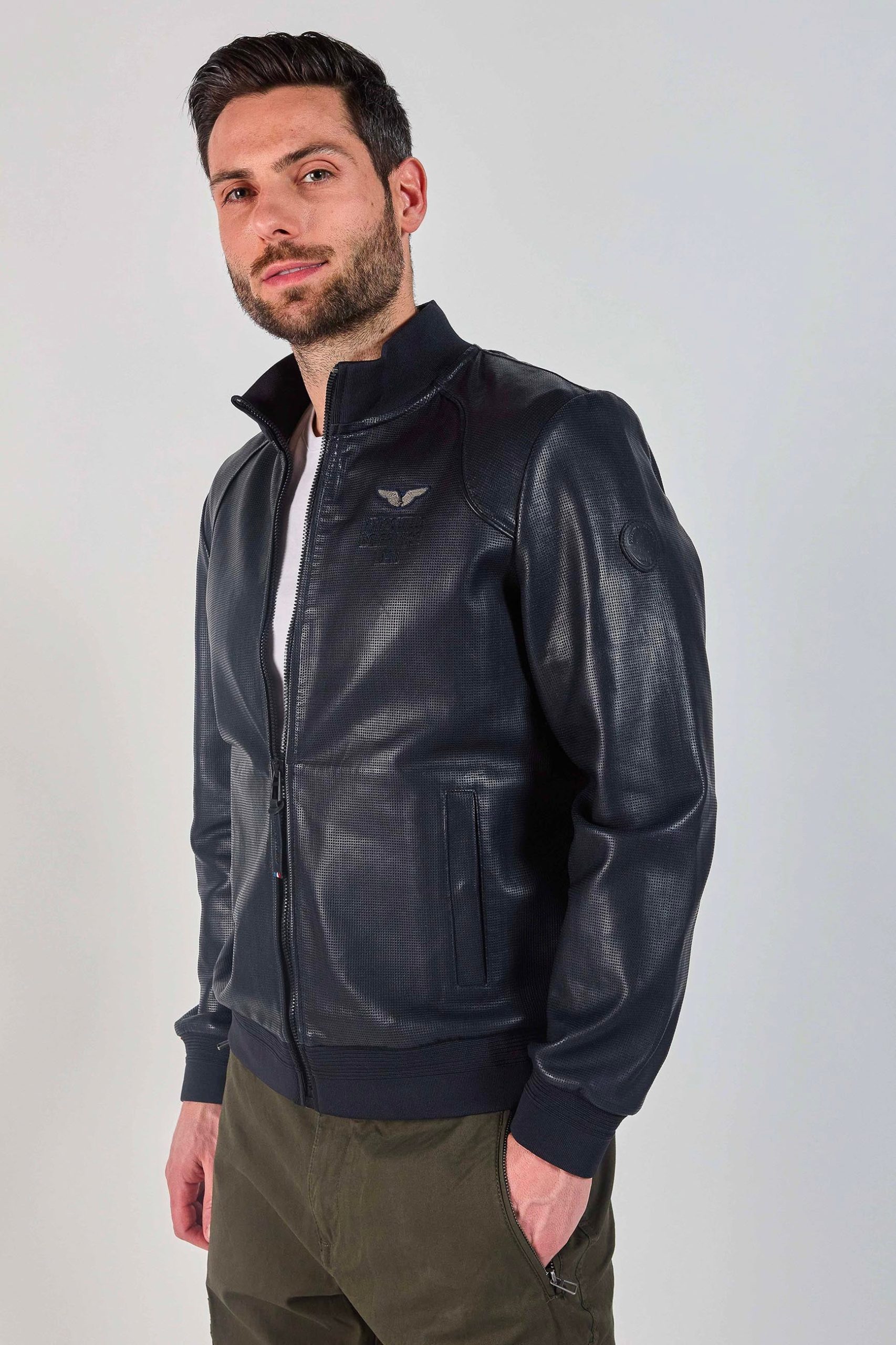Veste TURBO JET en cuir d’agneau perforé, col montant, 2 poches latérales avec bouton pression, petit drapeau français brodé sur la manche gauche. Collection Patrouille De France by Redskins.