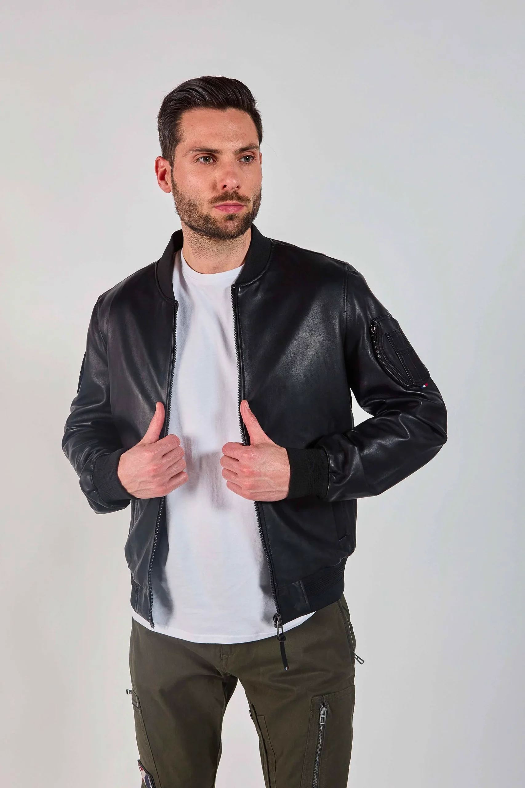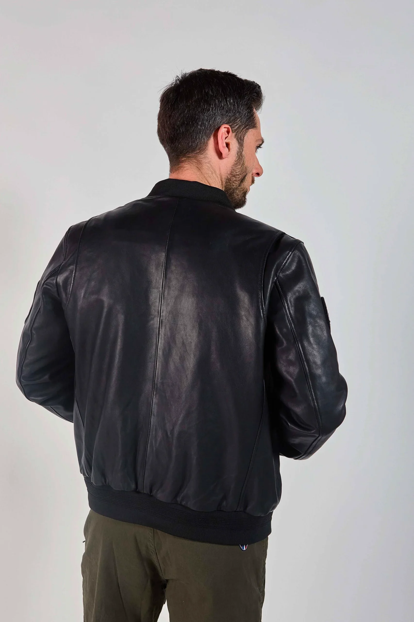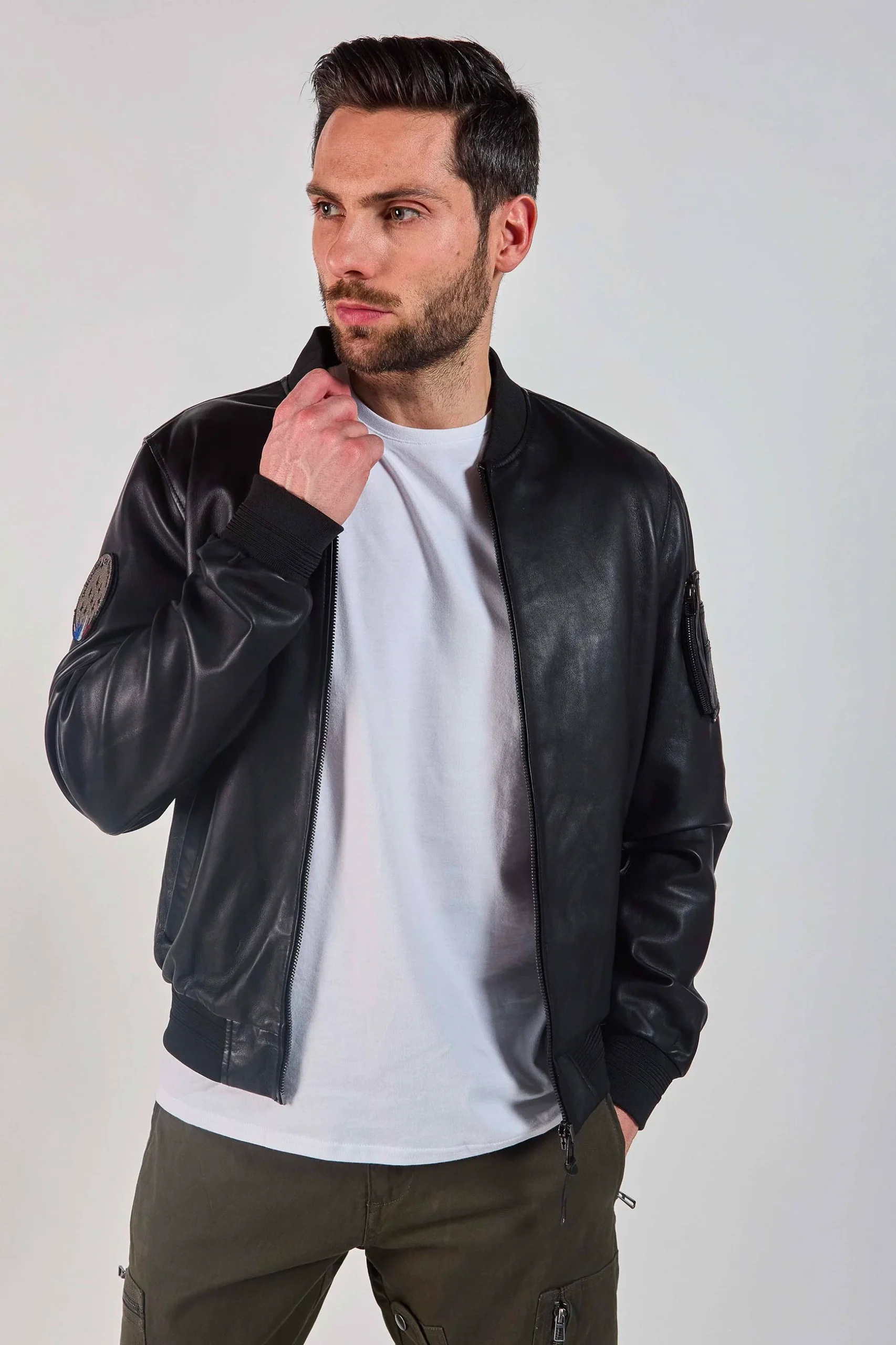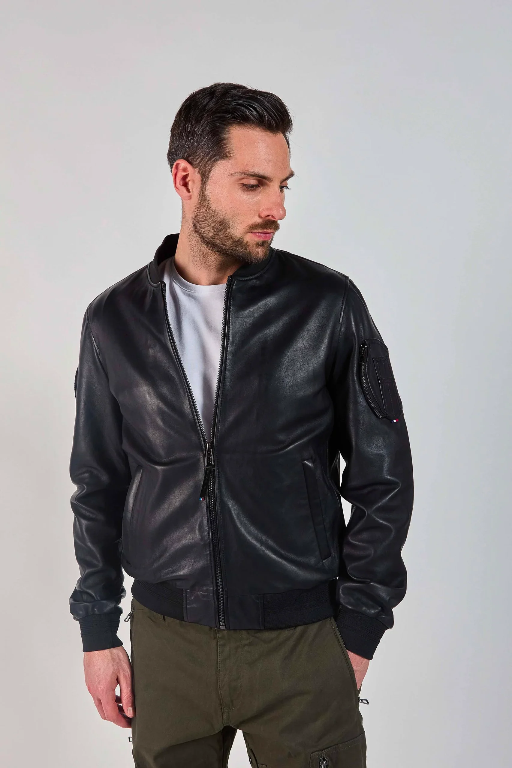 Veste FAUCON PALOMA en cuir d’agneau, col Teddy, 1 zip central, 2 poches raglans latérales, 1 poche raglan au niveau du torse le long du zip central, 1 poche zipée arrondie au niveau de l’épaule gauche, petit drapeau français brodé sous la poche de l’épaule gauche. Collection Patrouille De France by Redskins.