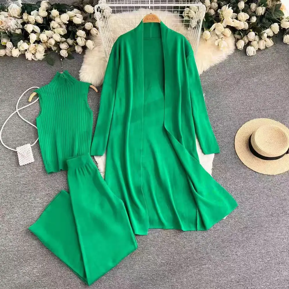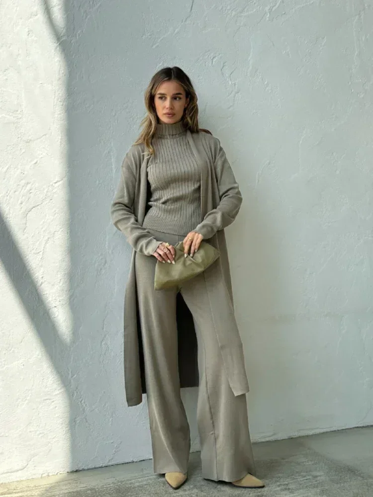 ENSEMBLE 3 PIÈCES EN MAILLE AVEC LONG GILET, PULL ET PANTALON