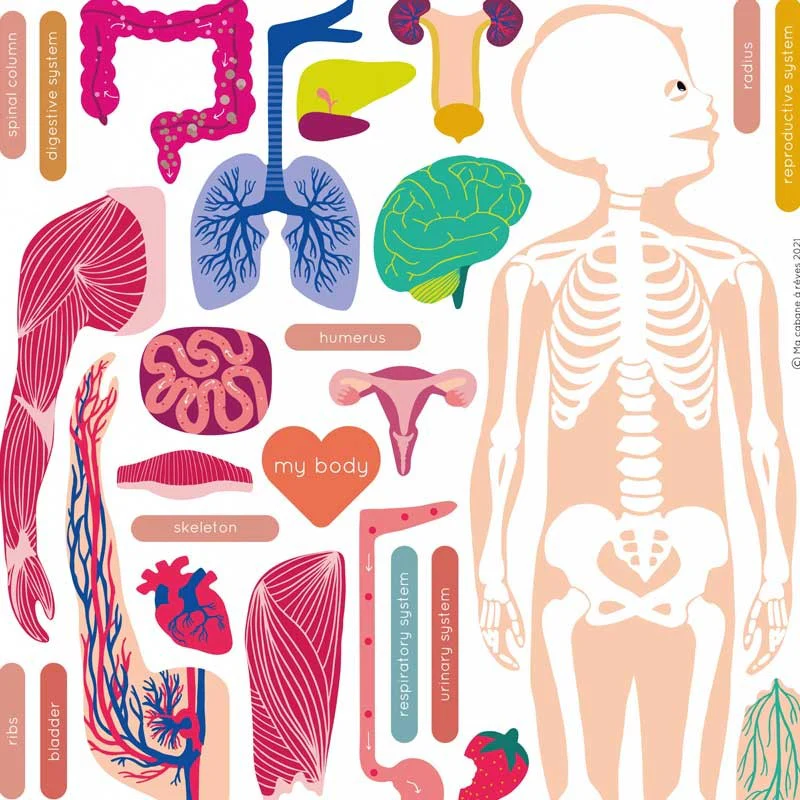 Avec cette collection, Hélène et Ma Cabane à Rêves revisitent l’apprentissage du corps humain. La Fabrikanatomie contient 11 organes vitaux, muscles, nerfs, artères et veines à positionner et superposer sur une silhouette d’enfant et 33 étiquettes réparties par code couleur pour chaque organe et os. Votre enfant pourra ainsi apprendre à placer et à nommer chaque organe en s’amusant.