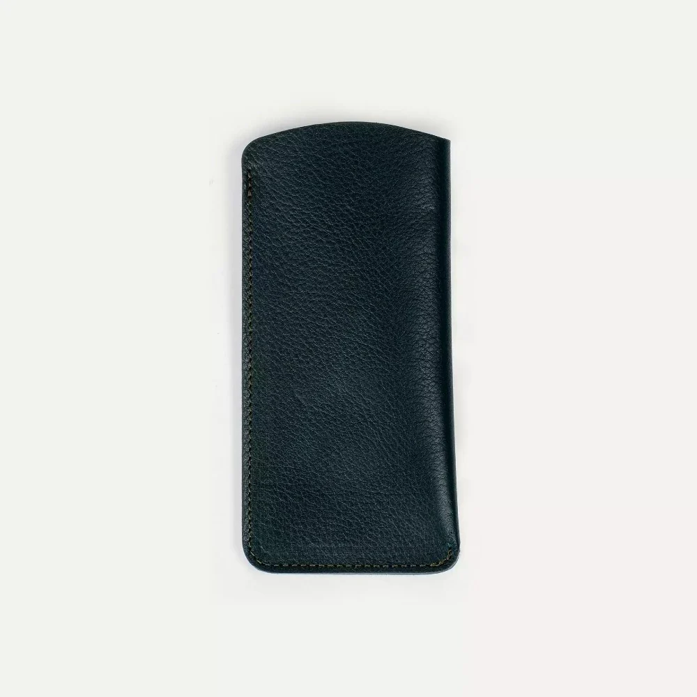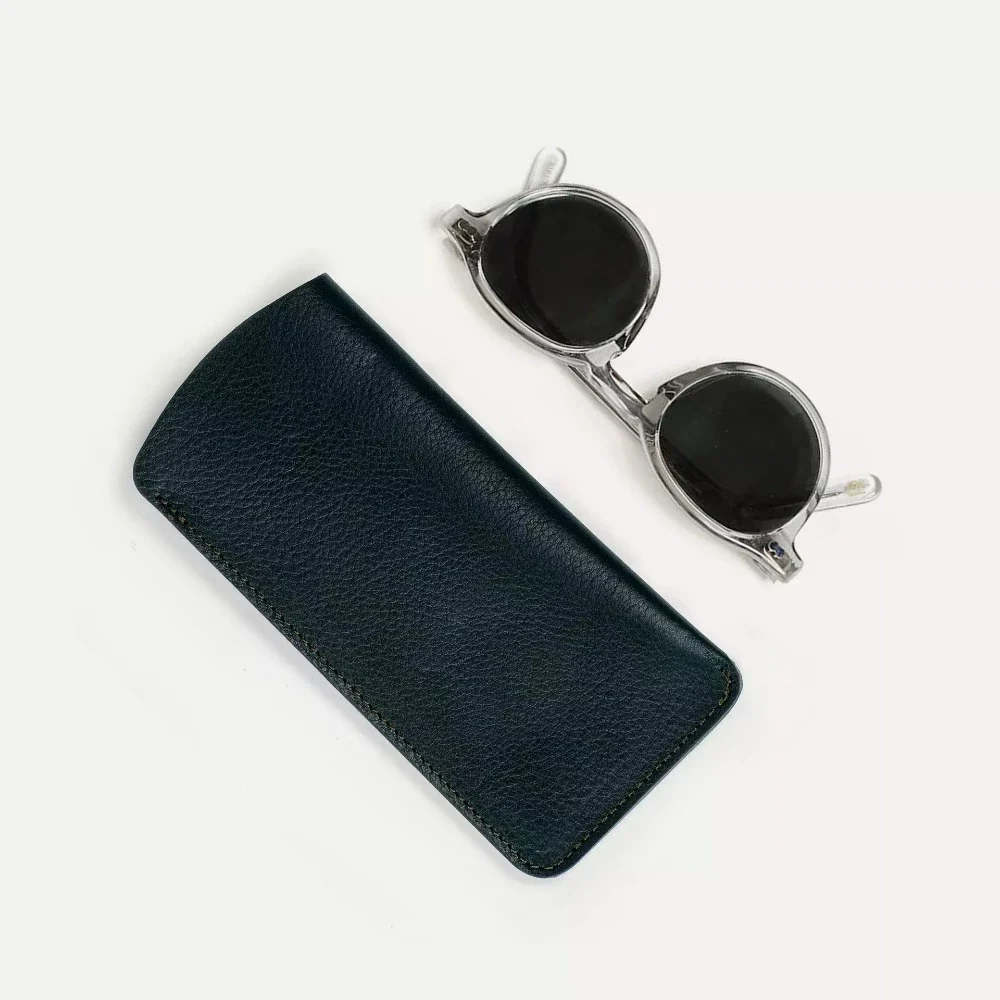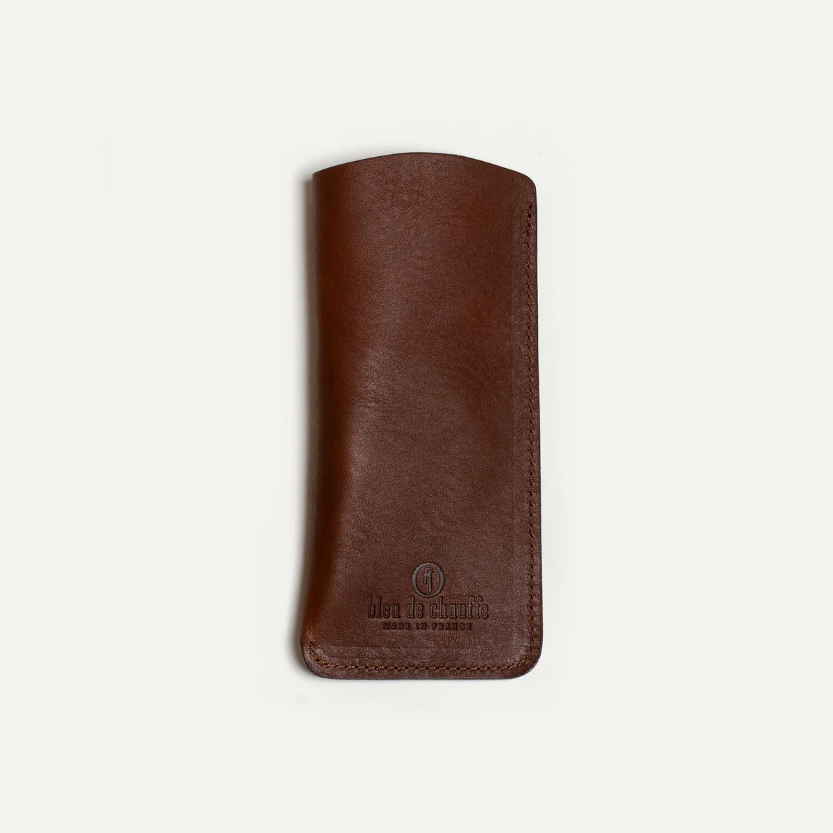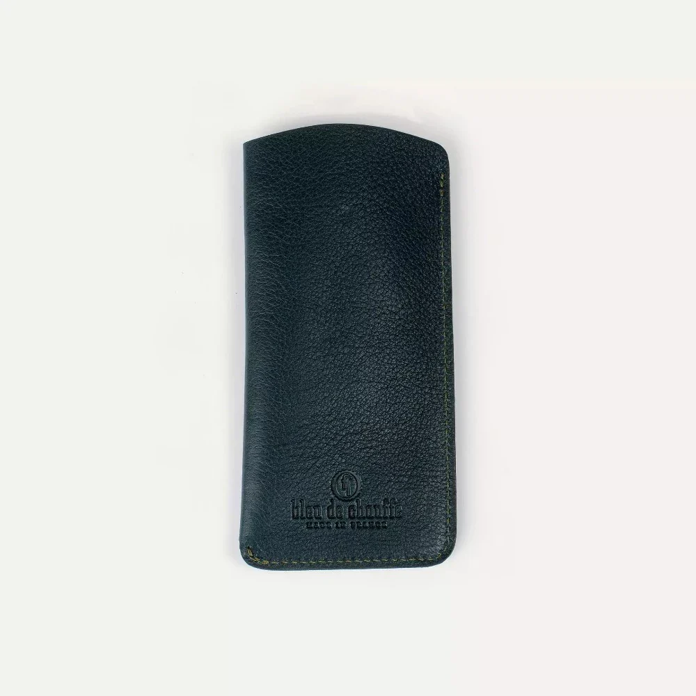L’étui à lunette ‘binocle’ Bleu de chauffe est en cuir tanné végétal souple.