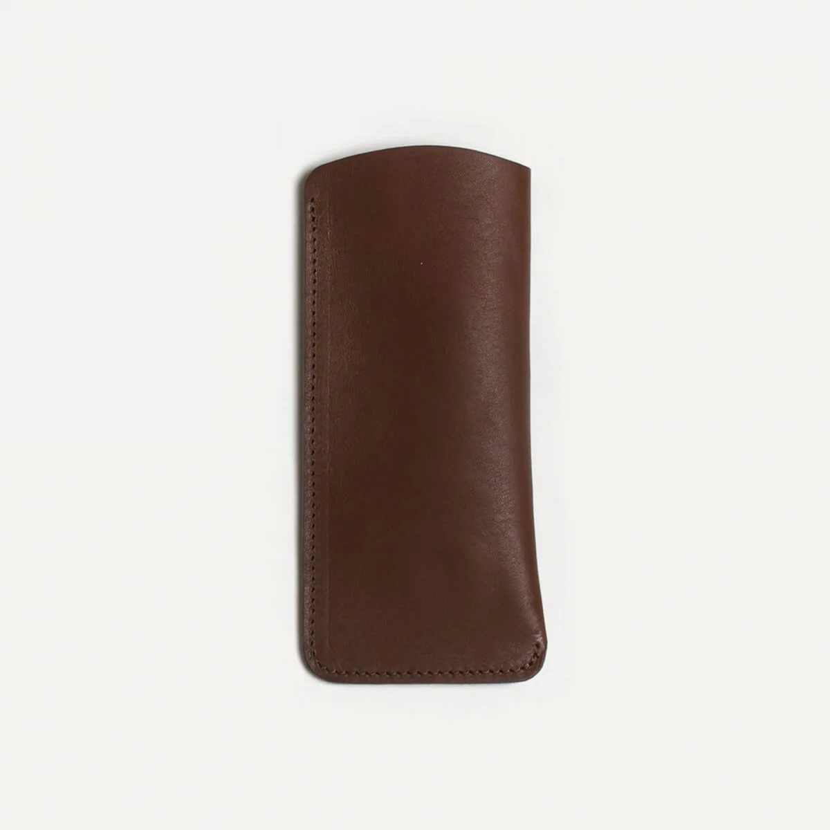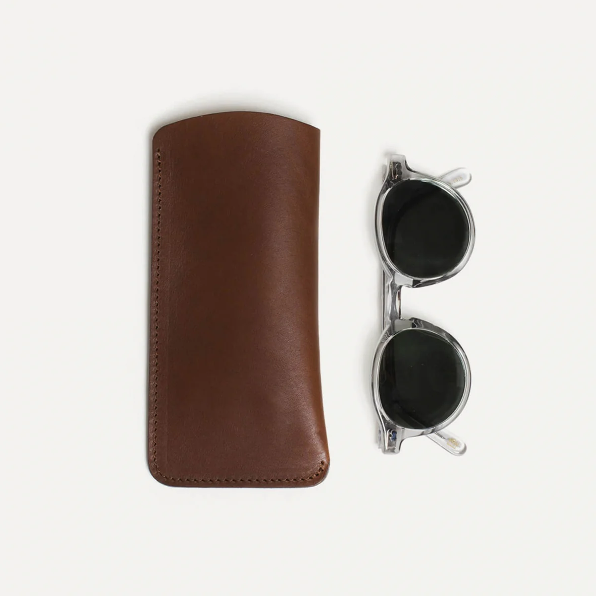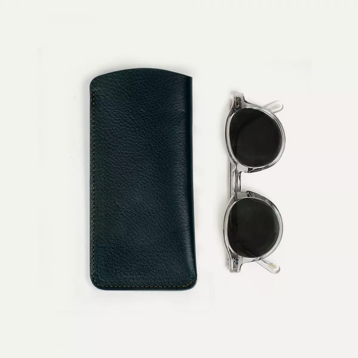 L’étui à lunette ‘binocle’ Bleu de chauffe est en cuir tanné végétal souple.