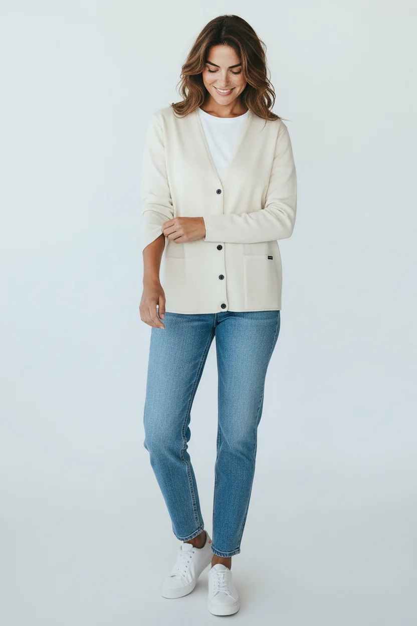 Inspiré de la bernique – ce petit coquillage solidement ancré sur les rochers bretons – le gilet « Bernic » incarne la robustesse et l’élégance naturelle. Tricoté en maille jauge 12 dans notre atelier de Ploubalay (Bretagne), il offre une silhouette féminine et moderne tout en reprenant les codes marins chers à Baie des Caps.