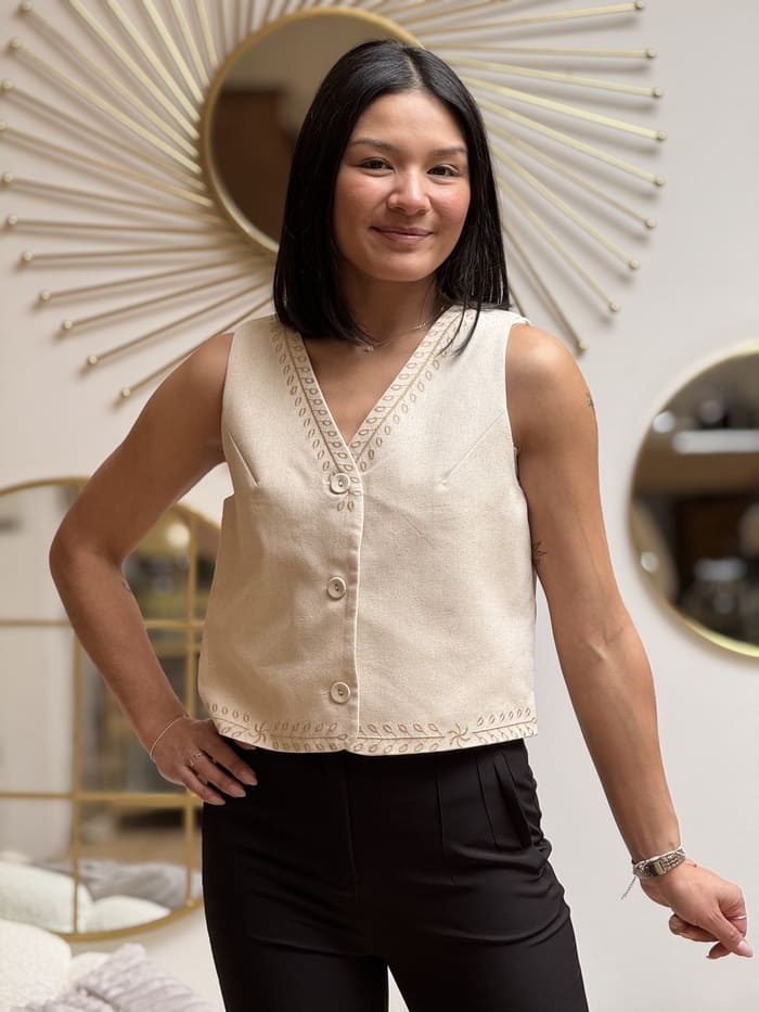 - GILET SANS MANCHE AVEC BRODERIE SUR LE BAS
