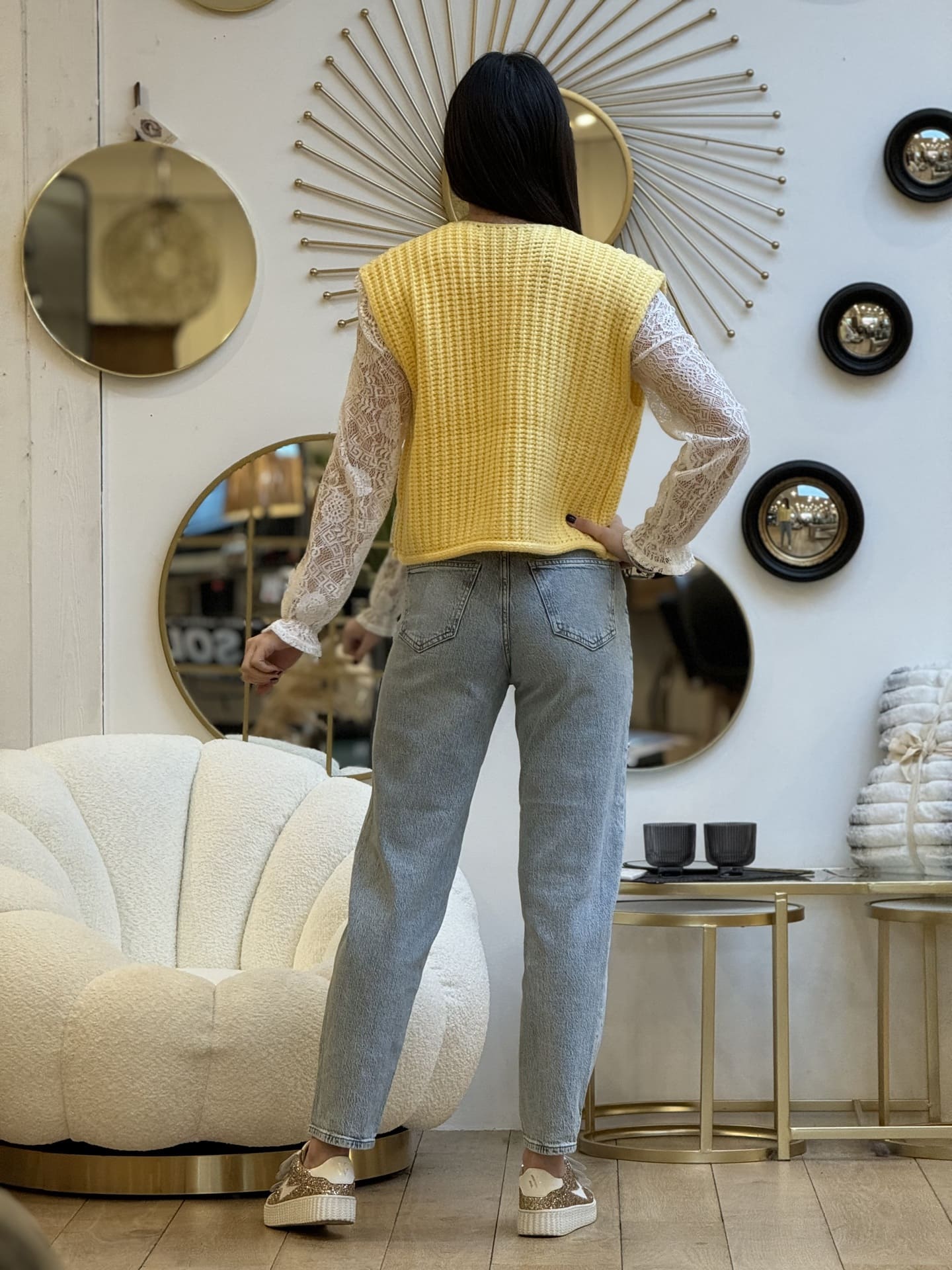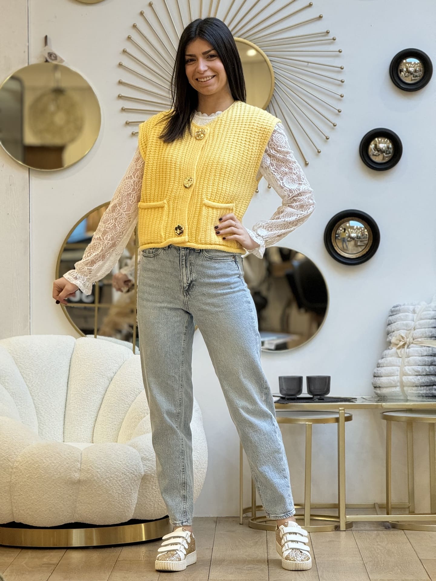 Gilet sans manche COL ROND GROSSES MAILLES AVEC 3 BOUTONS DORE + 2 POCHES Taille : Justine mesure 1m69. Elle porte la taille Taille unique pour ce modèle. Taille : Taille unique Convient de la taille 36 à 42. Composition & entretien : 42% VISCOSE 30% POLYESTER 28% POLYAMIDE Lavage à la main conseillé Besoin […]