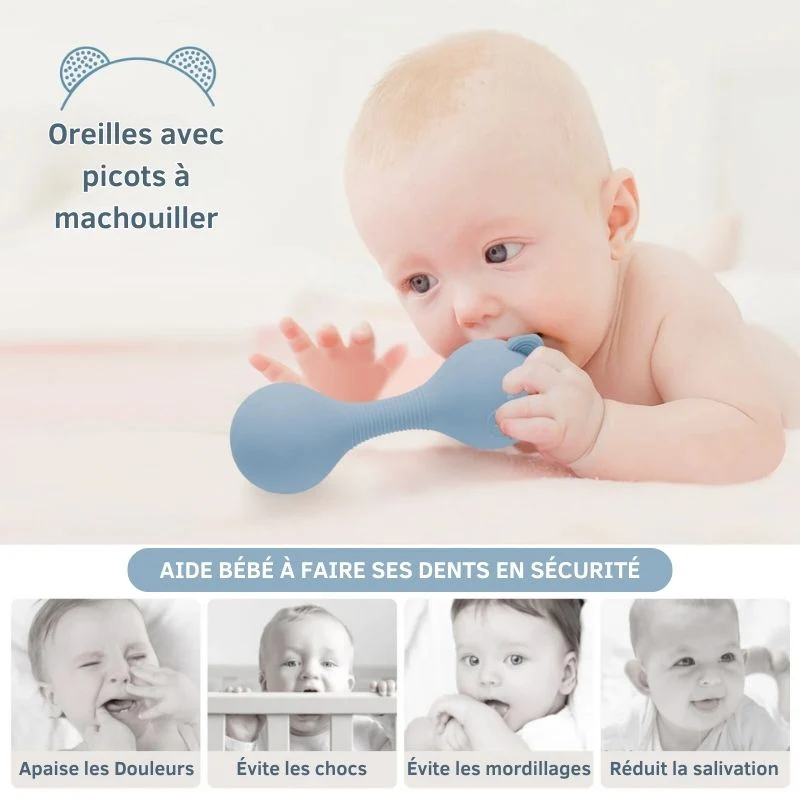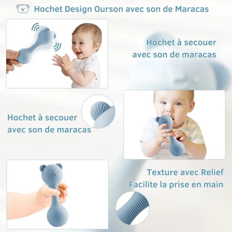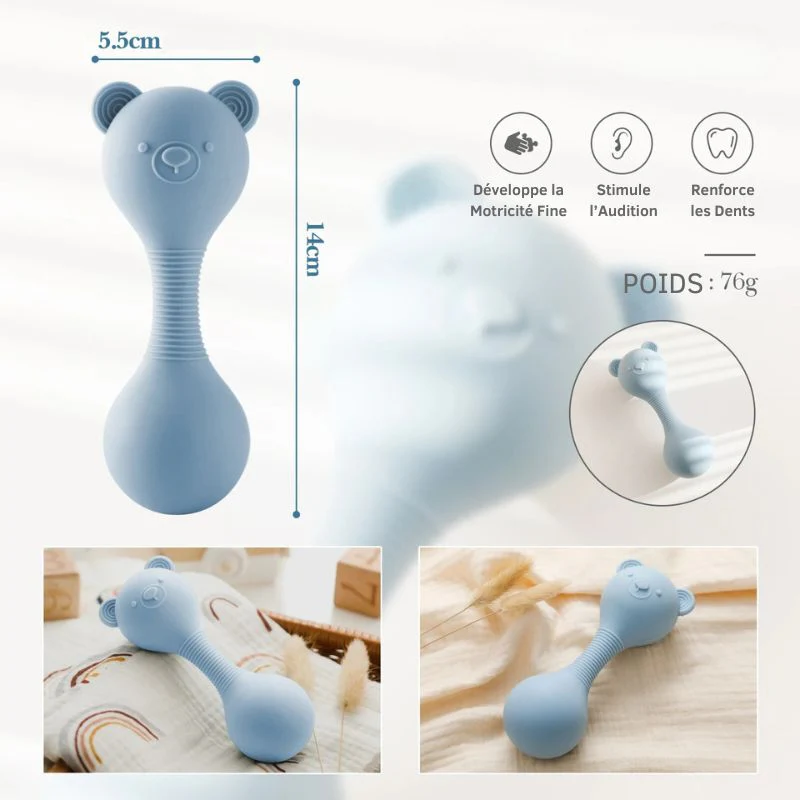 Découvrez ce hochet en silicone, avec son doux son de maracas, conçu spécialement pour les premiers mois de bébé. Découvrez dans des instants de tendresse en offrant un jouet qui invite aux moments de partage et de découverte.