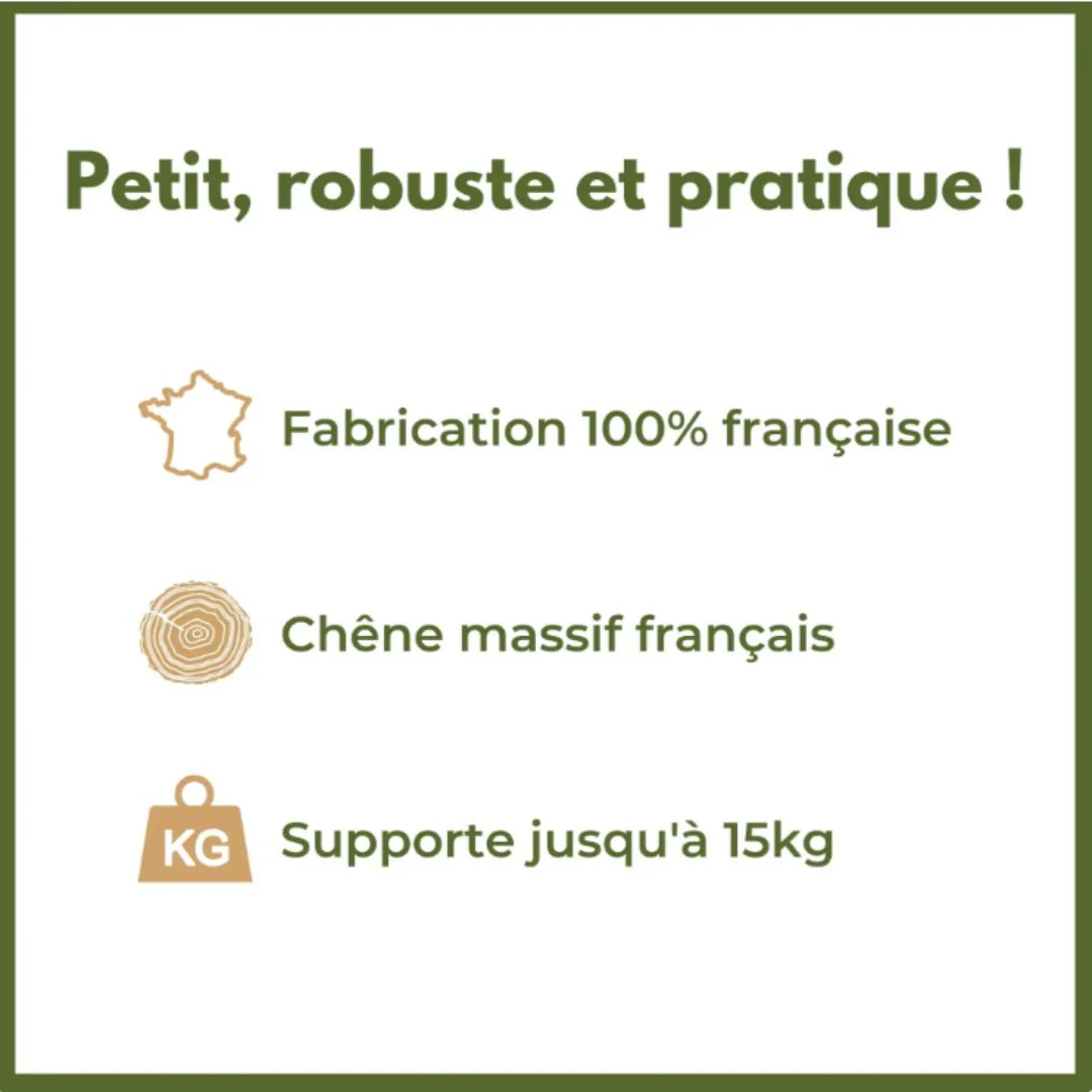 Le bois étant un matériau naturel, le produit peut présenter des petites variations de teinte, un veinage différent ou de petites imperfections. Mais soyez certain d’avoir un produit unique fabriqué avec amour dans notre atelier !