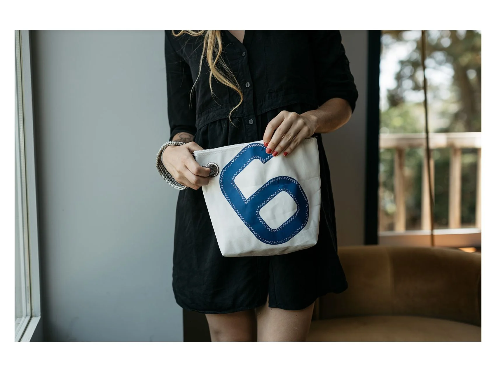 Elle se porte à la main. La Midinette est réalisée à partir de voile de bateau 100% recyclée. Numéro 6 bleu cousu avec notre célèbre point ZigZag.