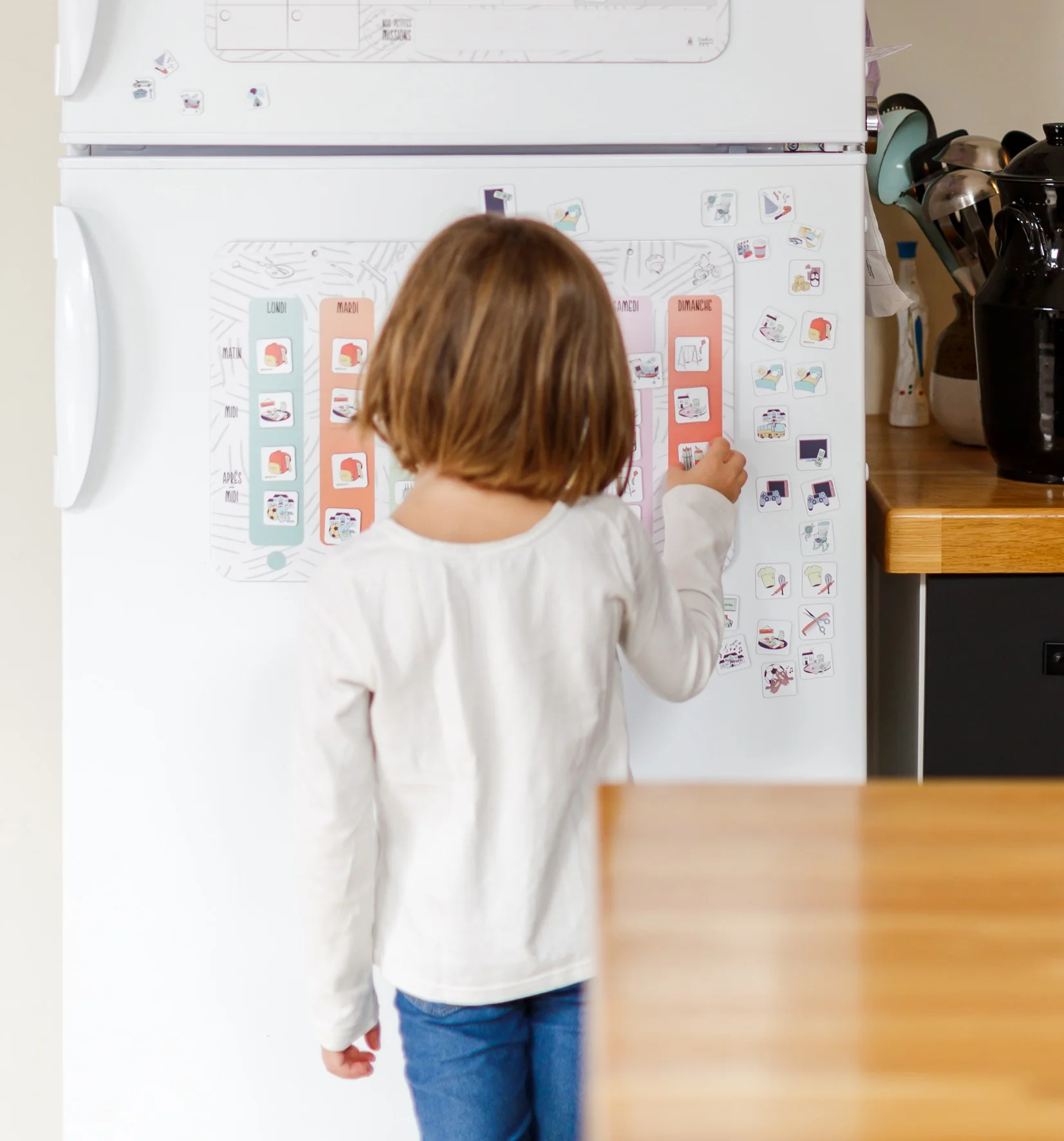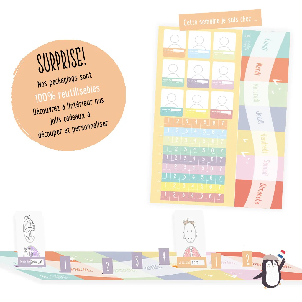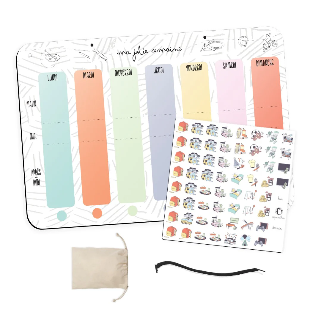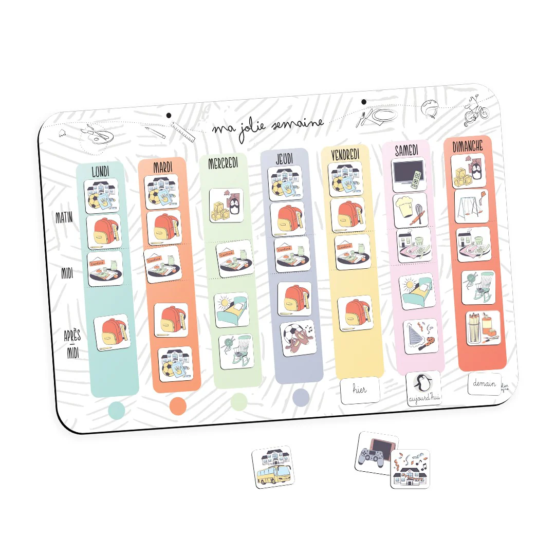 Le manque de repères dans le temps favorise le stress et l’anxiété des plus petits. On l’observe notamment lors des séparations (école, nourrice…) ou lorsque les emplois du temps sont bouleversés (changement de situation familiale, activité de dernière minute…). Visualiser le déroulé de la semaine permet à votre enfant de pouvoir appréhender les évènements qu’il va vivre. Il peut ainsi se repérer dans le temps à travers ses activités quotidiennes( « est-ce qu’ il y a école demain ?», « où est-ce que je mange ce midi ?»).