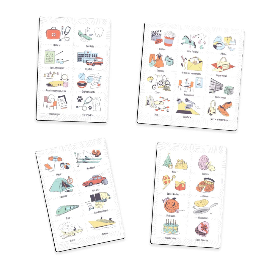64 magnets ( 3/3cm) : fête de l’école, sortie scolaire, sieste, jeux d’intérieur, activités artistiques, jeux d’extérieur, coiffeur, pâtisserie, école, rentrée scolaire, cantine, grands-parents, jeux vidéo, conseil de famille, fête, centre périscolaire, repas maison, sport, magnet vierge, hier, aujourd’hui, demain.