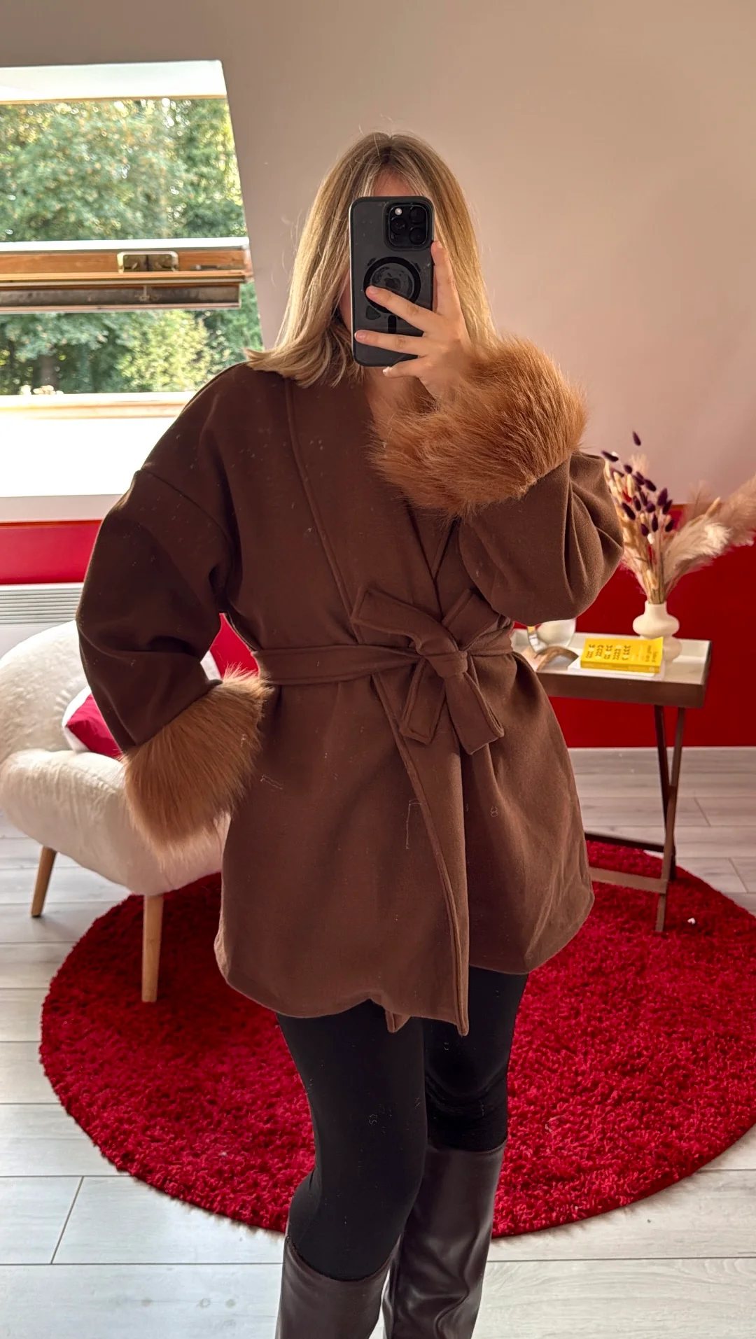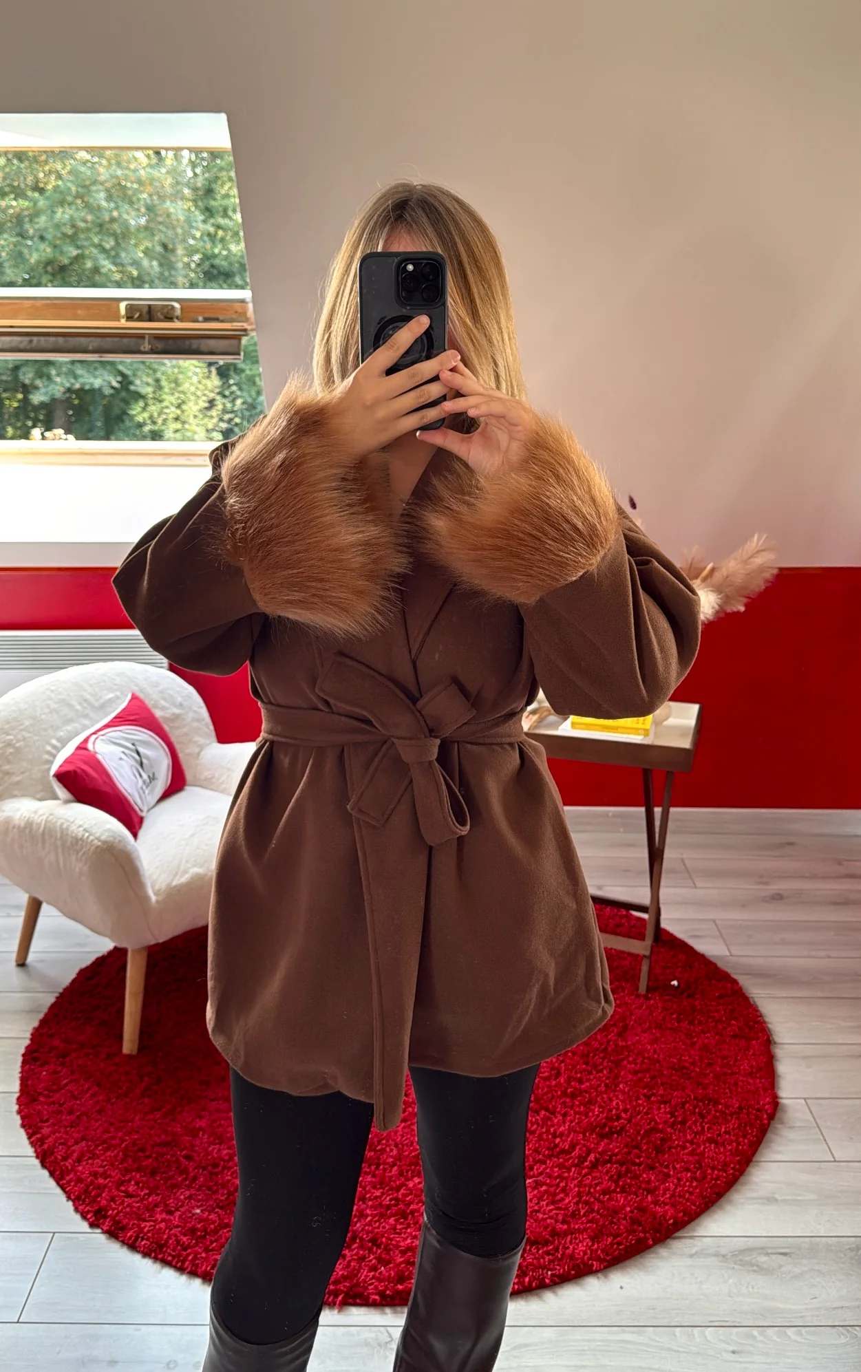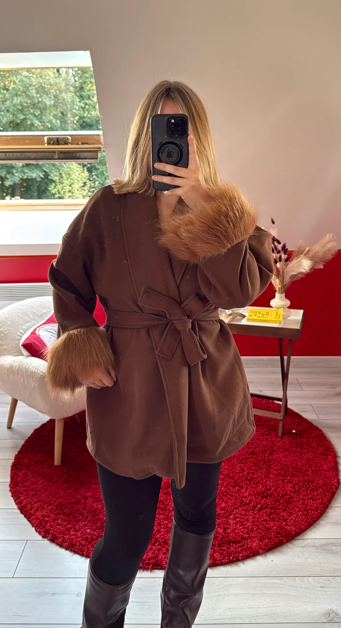 MANTEAU COURT MANCHE FOURRURE CHOCOLAT