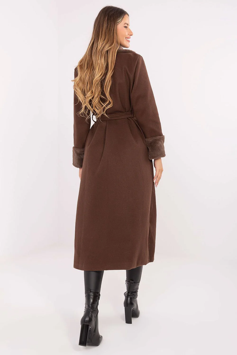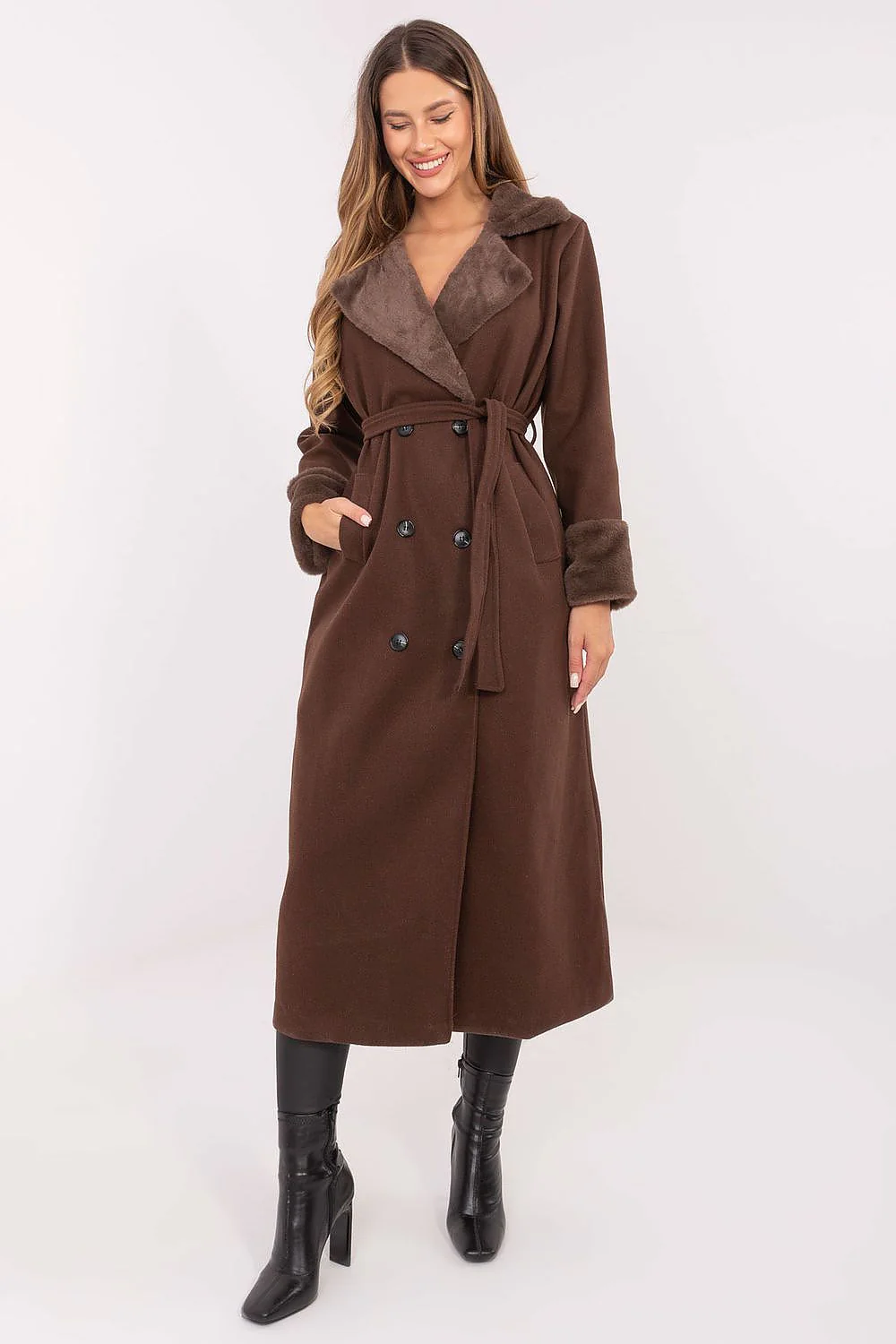Manteau long Ceinture intégrée Col et manchettes en fausse fourrure Double boutonnage Avec poches