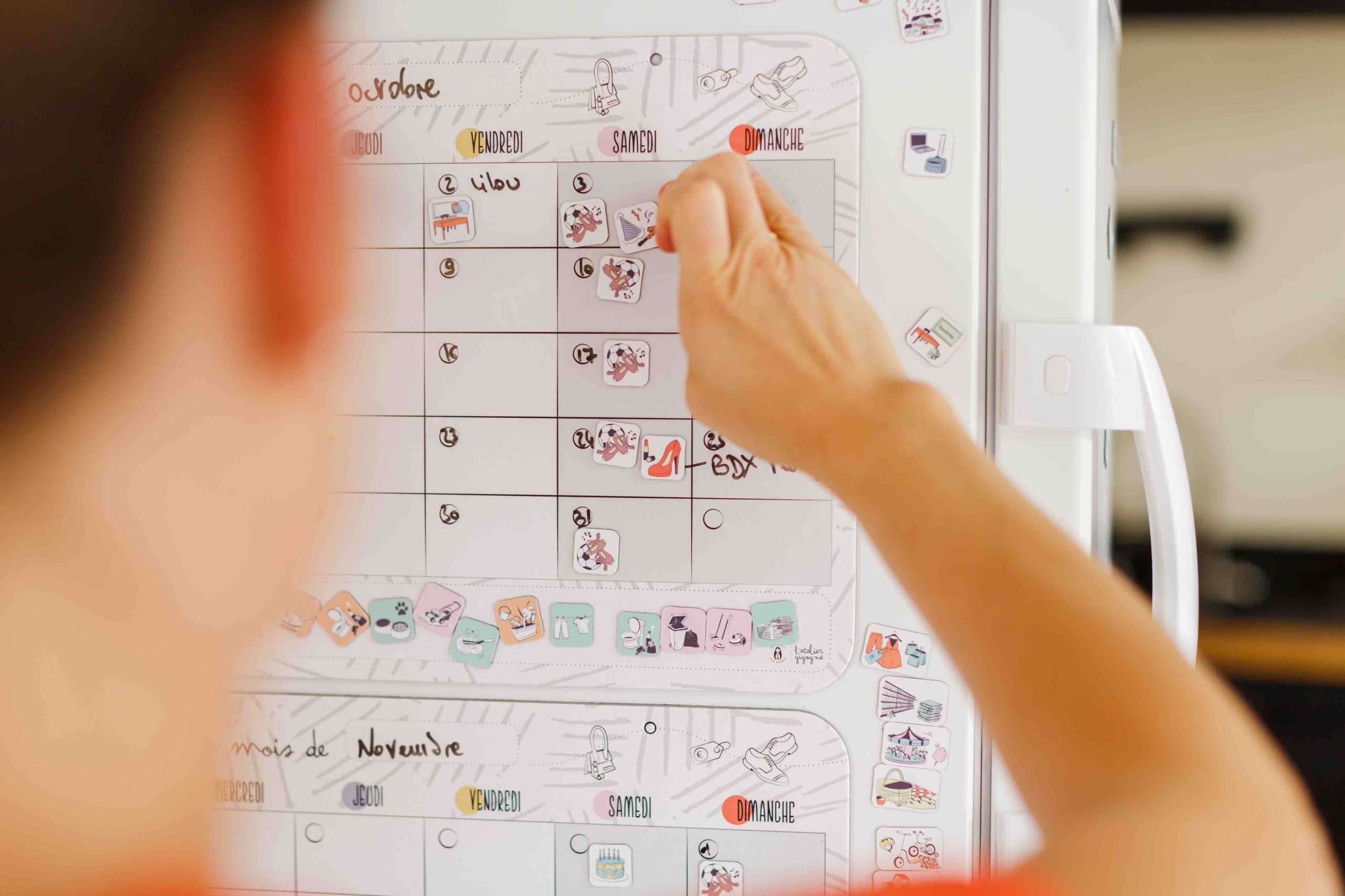 L’organisateur mensuel est un support conçu pour aider à organiser la vie de famille et permettre à chacun de visualiser en un seul coup d’œil l’emploi du temps du foyer. Vous pouvez partager les informations importantes et aider les enfants à se repérer dans le temps. Les magnets vous permettent de visualiser facilement les évènements à venir et rendent l’organisation ludique.