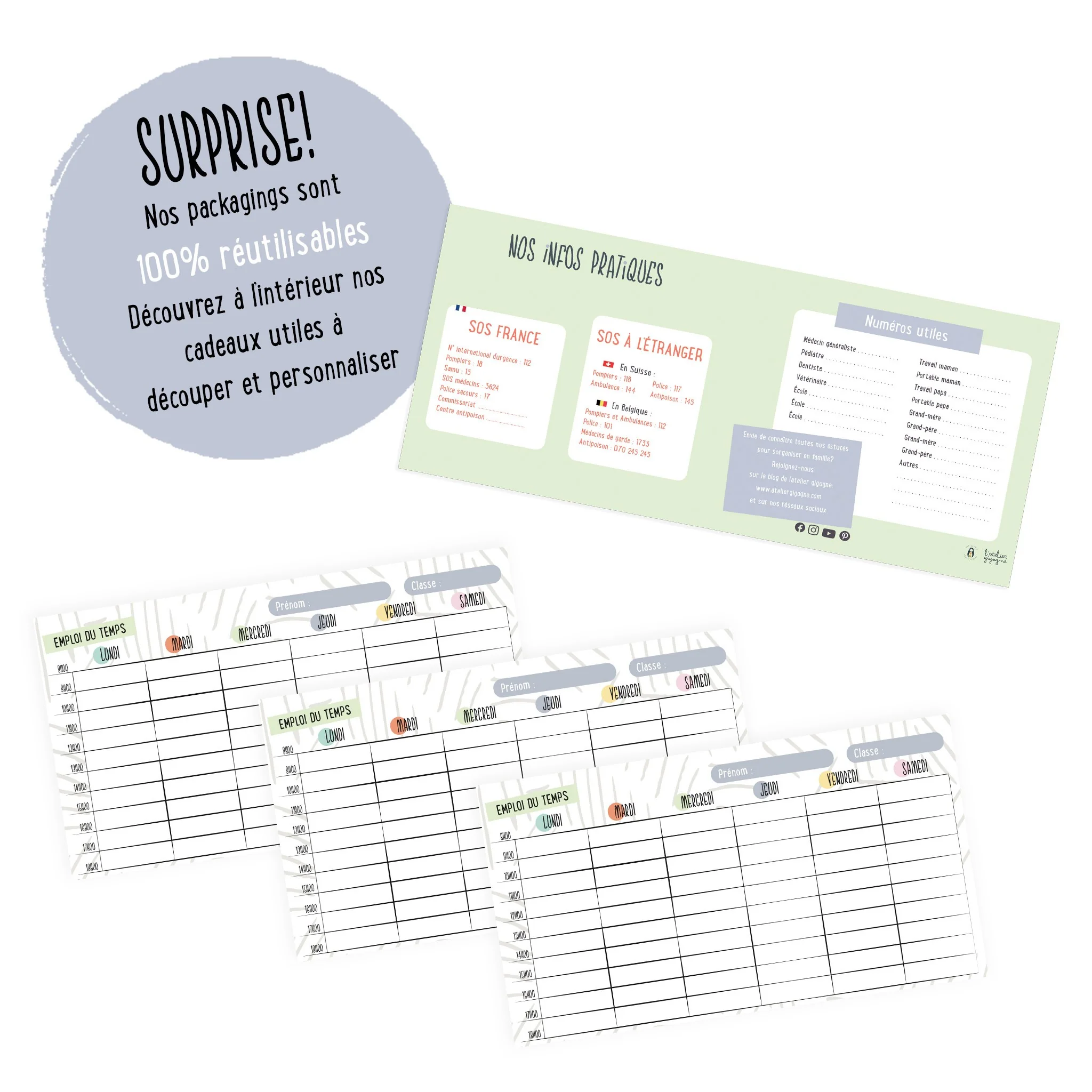 L’emballage est 100% réutilisable : à l’intérieur se trouve un petit cadeau à découper et personnaliser. En plus d’être très utile et éco-conçu, votre organisateur mensuel familial est 100% français !