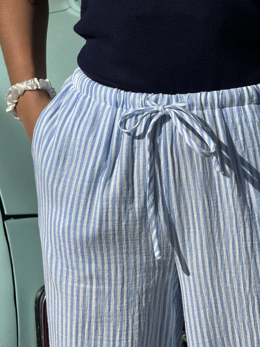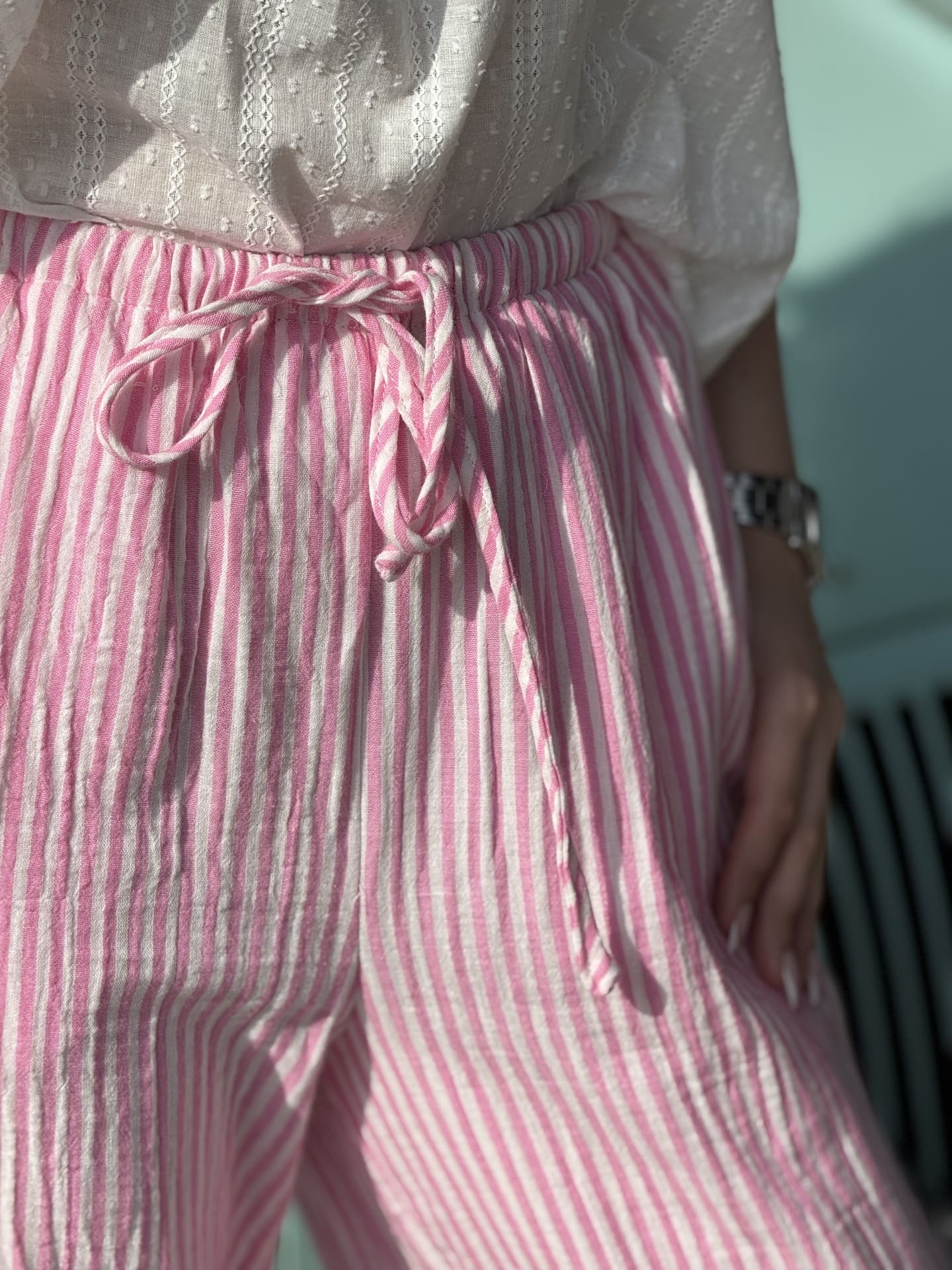 - Pantalon fluide en gaze de coton avec lien à la ceinture + 2 poches – imprimé rayures
