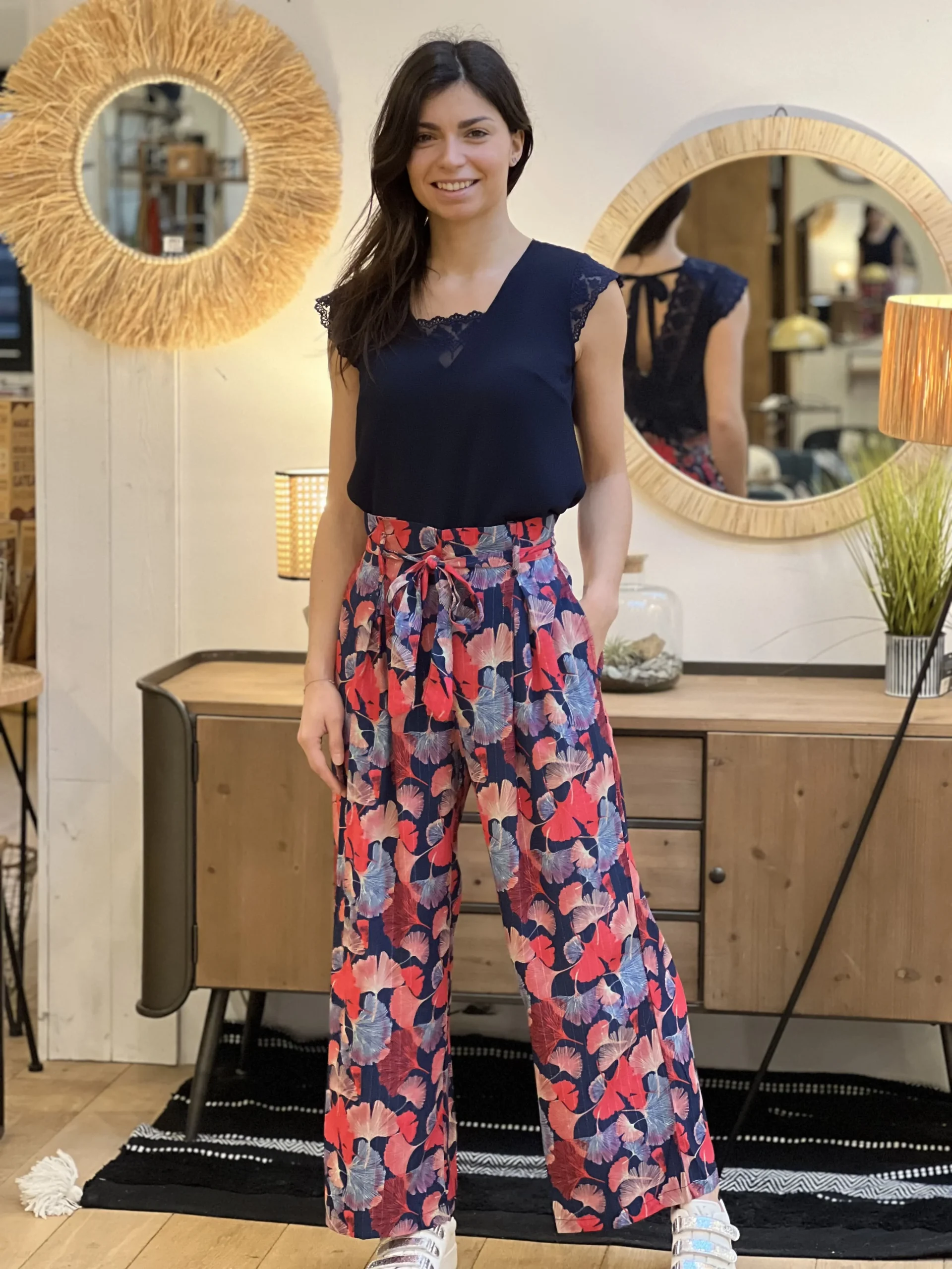 - PANTALON LARGE MOTIF FEUILLE ROUGE