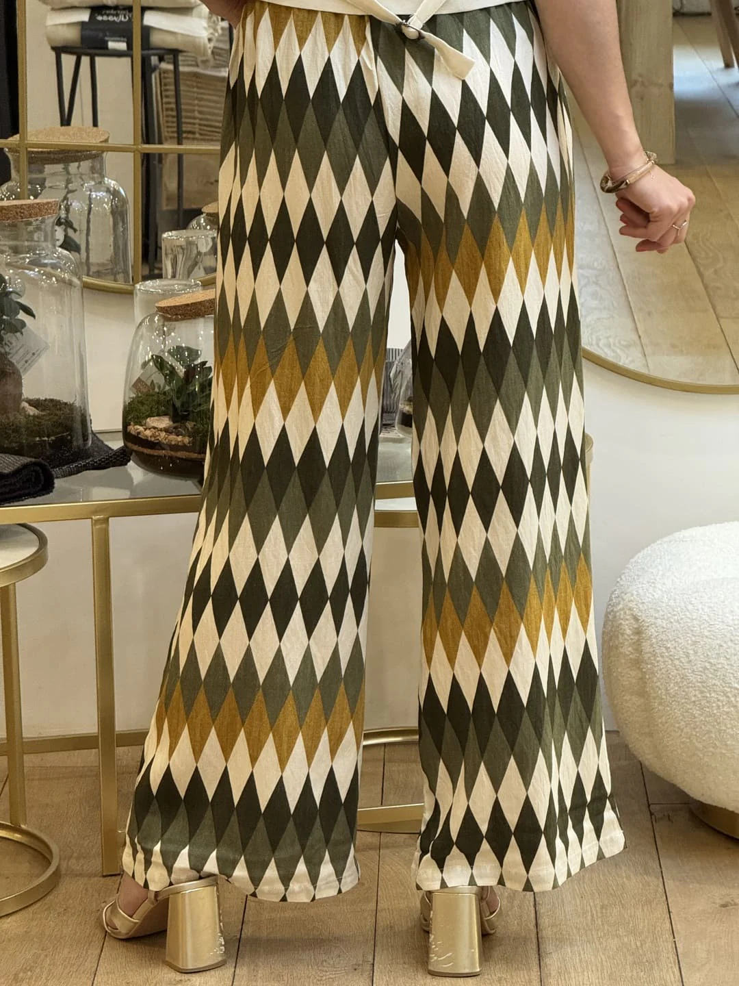 - PANTALON LARGE FLUIDE CEINTURE À LA TAILLE IMPRIMÉ LOSANGE COLORÉ