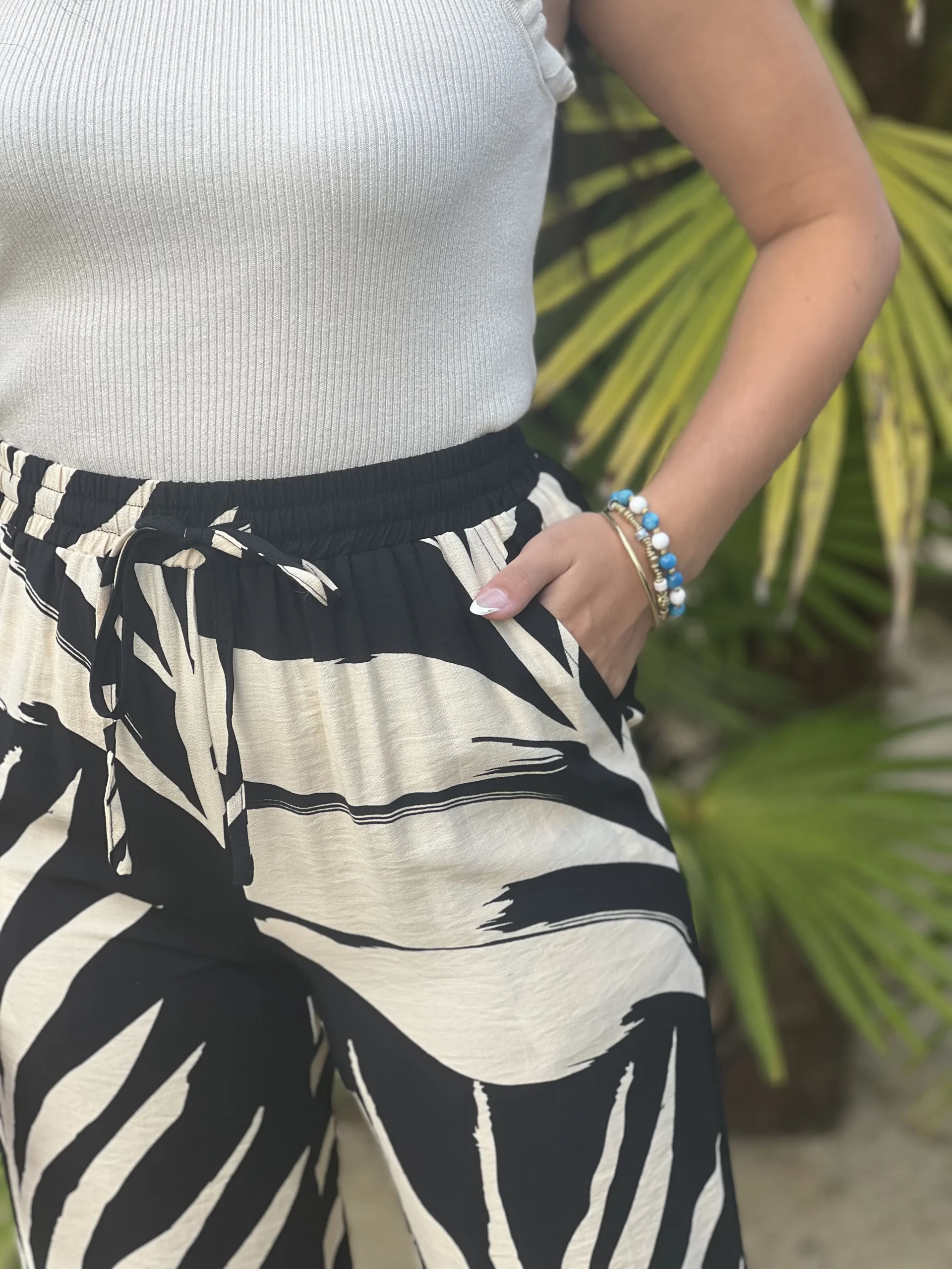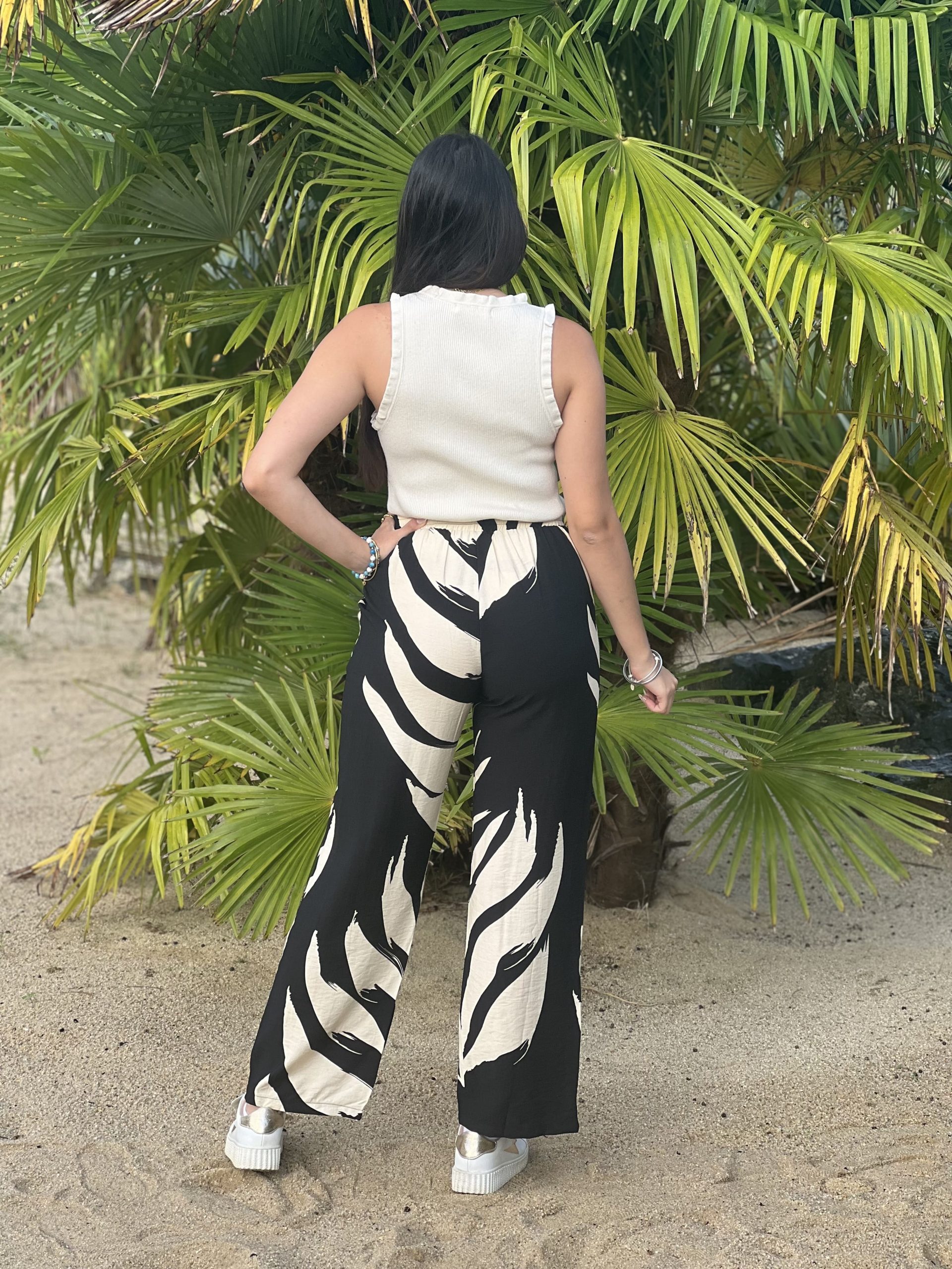 - Pantalon fluide avec ceinture à la taille – imprimé feuilles blanche