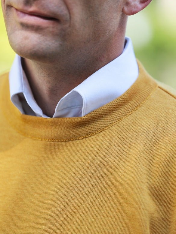 Coupe confort, col en rond, manches longues, tricot maille pleine, bordures côtelées