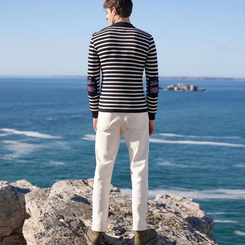 Découvrez le co-branding le plus original de l’année, alliant style et responsabilité ! Ce pull marin pour homme est orné de coudières créées par Berthe « Aux Grands Pieds ». Cette collaboration made in France met en avant un magnifique pull, fruit d’une production locale et durable. Adoptez une mode éthique tout en restant élégant !