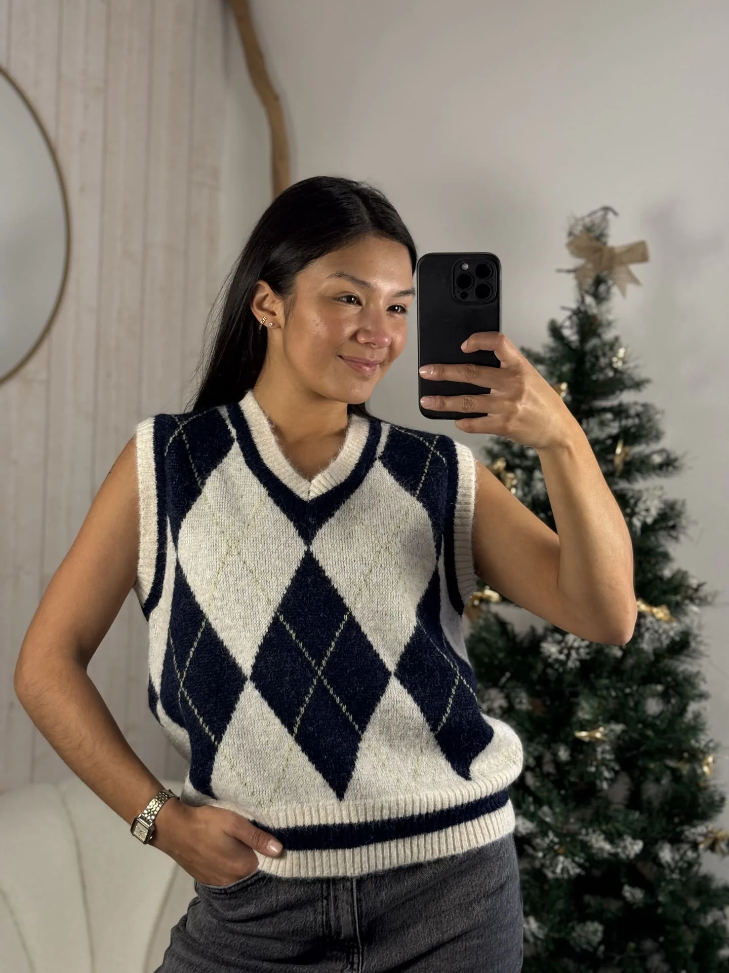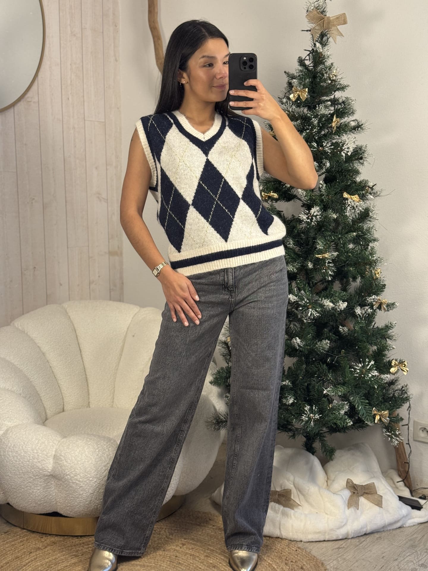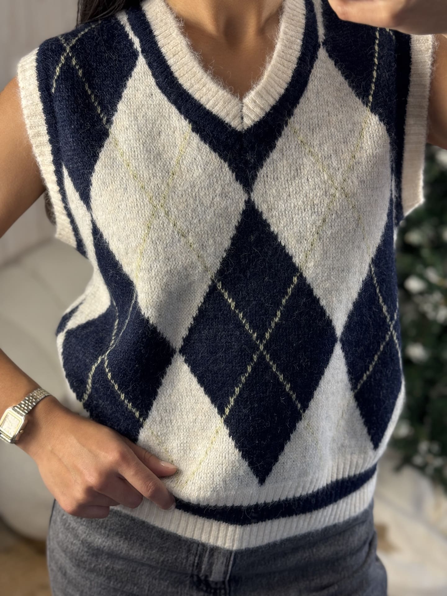 - Pull sans manche col v imprimé à carreaux