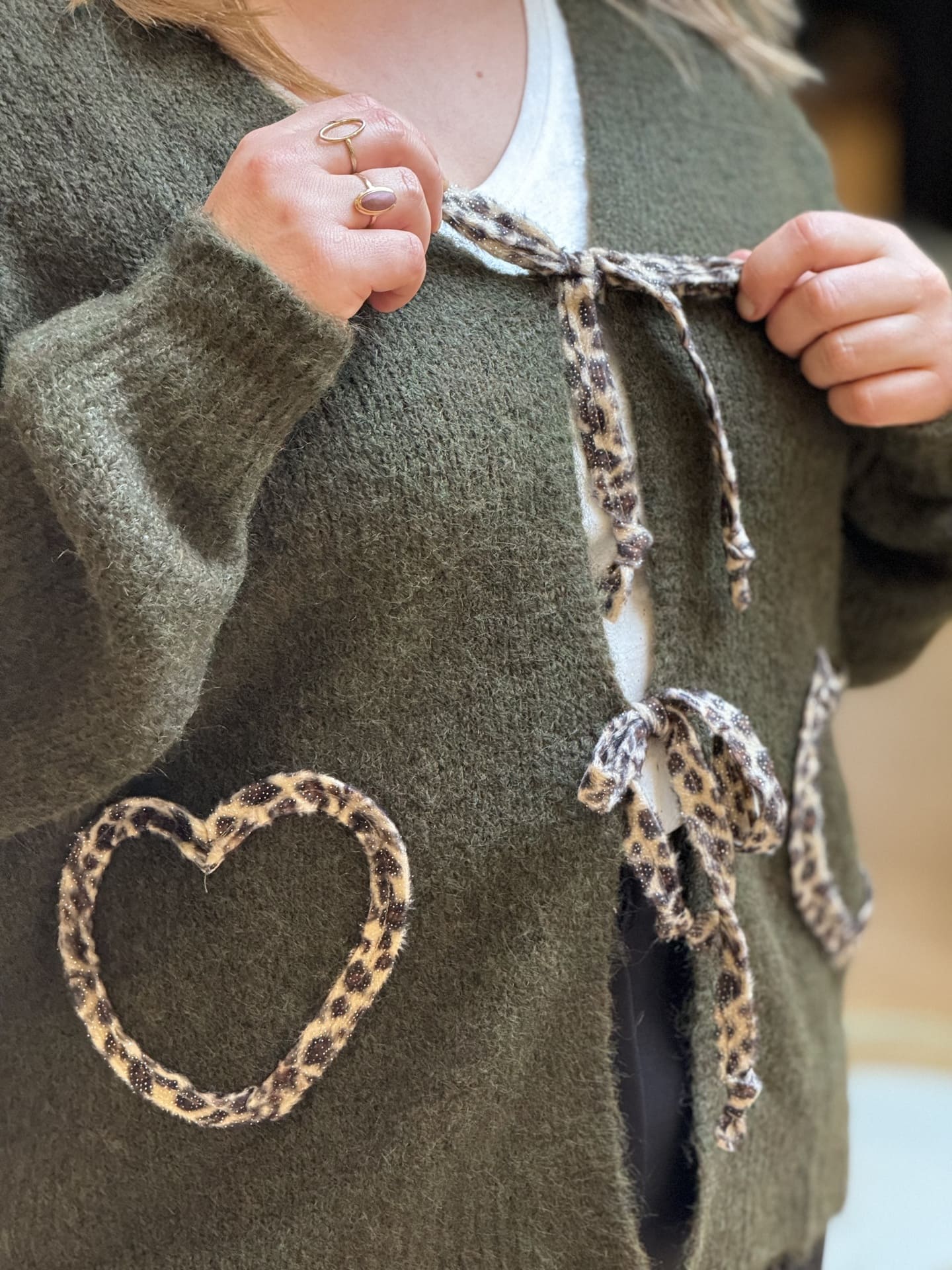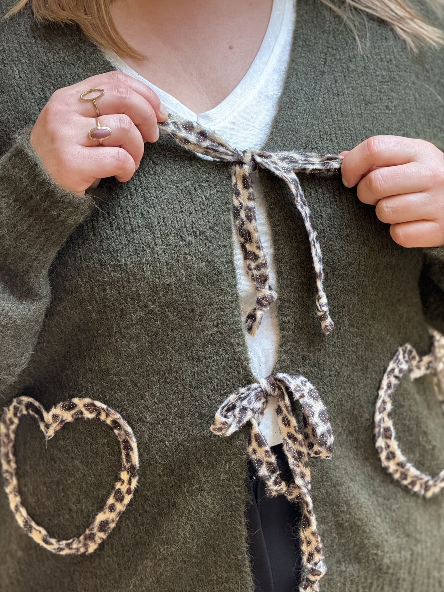 - Pull à ml col v avec nœuds devant léopard + 2 cœurs léopard au niveau des poches