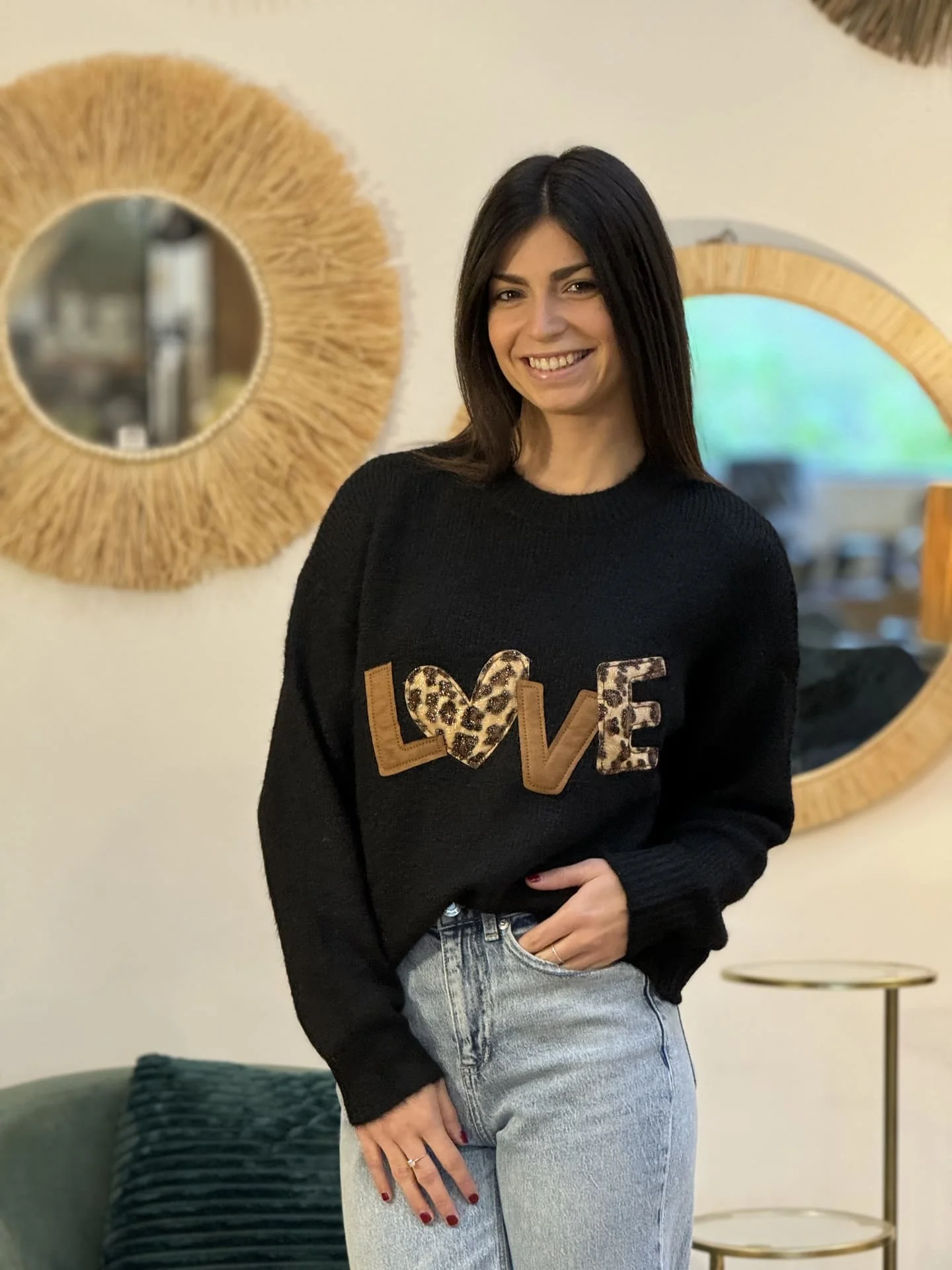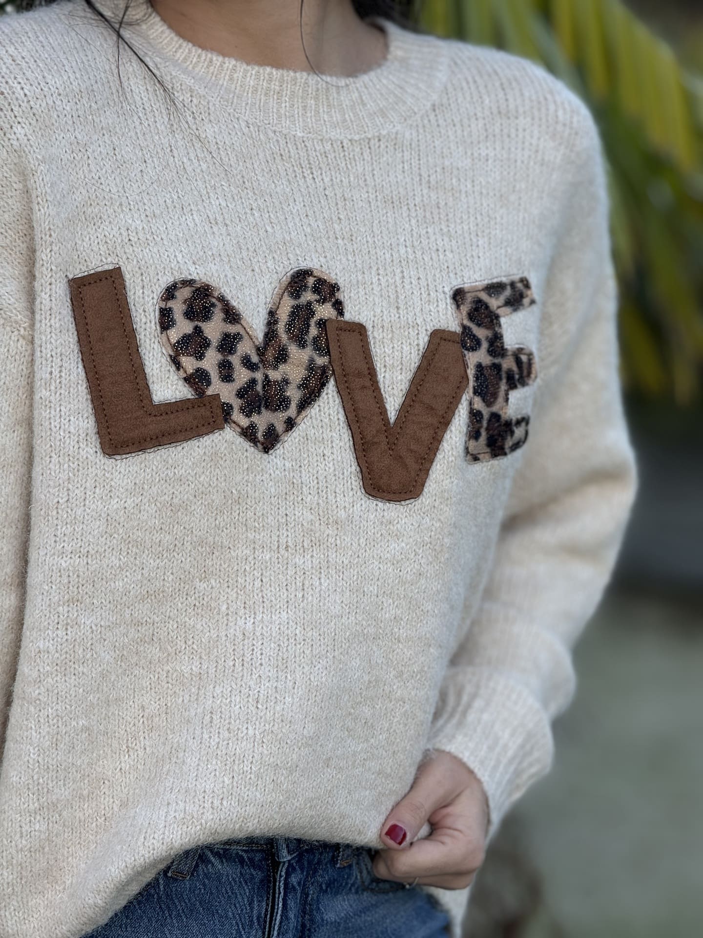 - Pull à ml col rond inscription LOVE en léopard